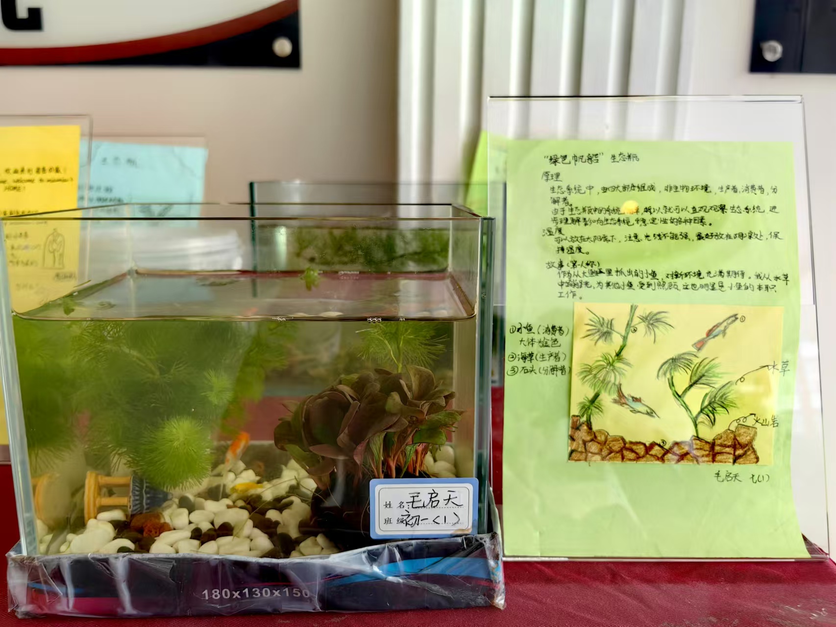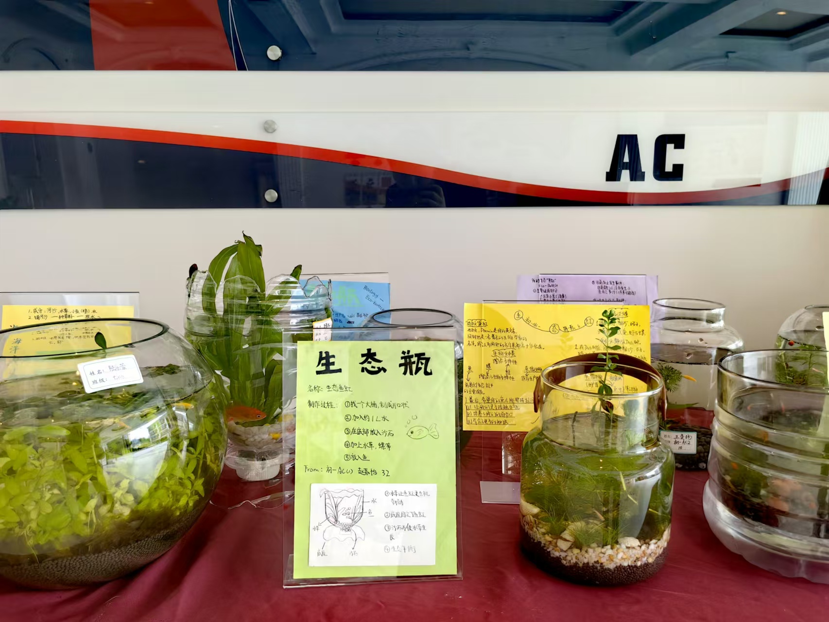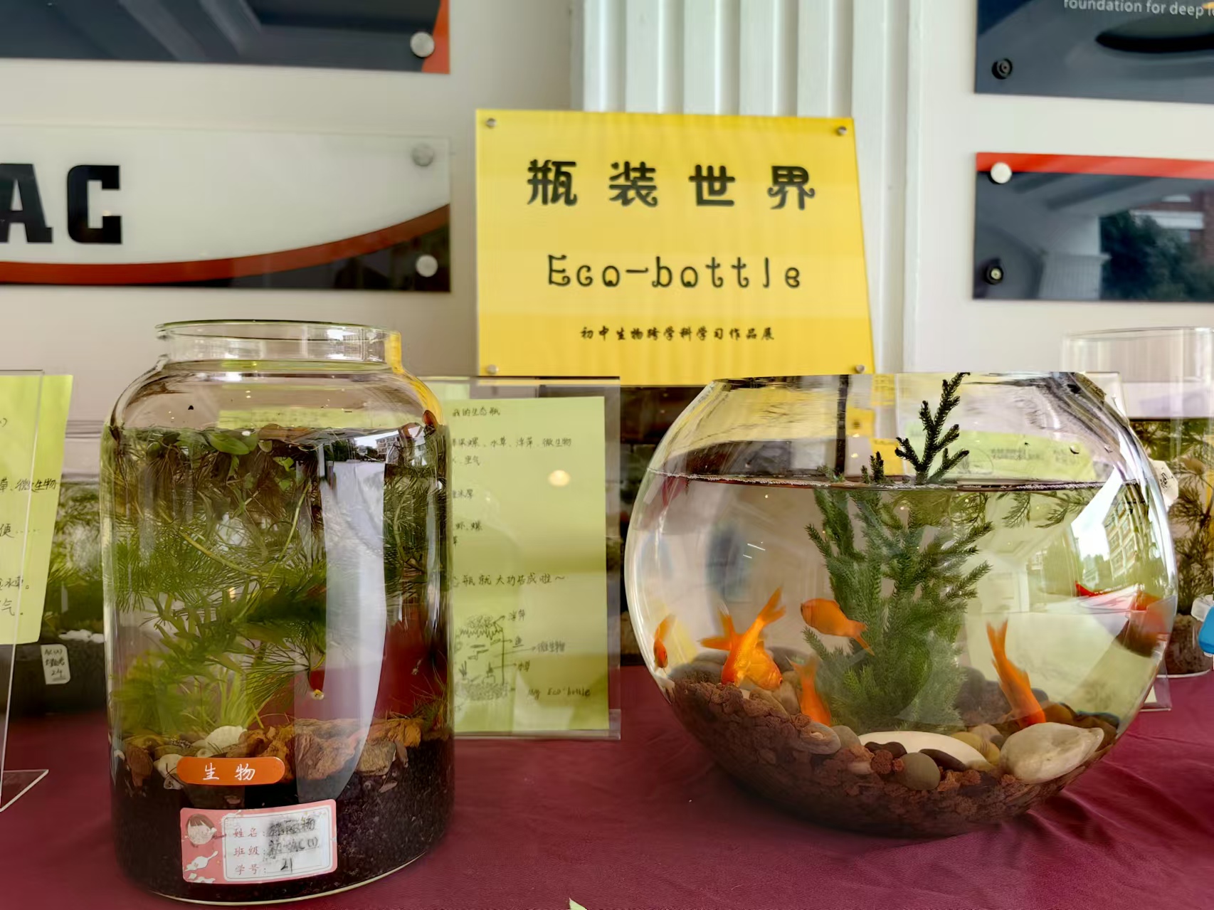 近日,教学楼一隅人头攒动学生络绎不绝,初中生物组跨学科学习“水中世界”Eco-bottle学生成果展正在展出。此次项目式学习融合了生物学、环境科学、艺术设计等多个学科,各式各样的生态缸中装着小型水生生态系统,错落有致地摆放在展台上,水生植物郁郁葱葱,鱼类和其他生物在水中自由游弋,构成了一个美丽而和谐的生态系统,宛如一个个生动的小世界。