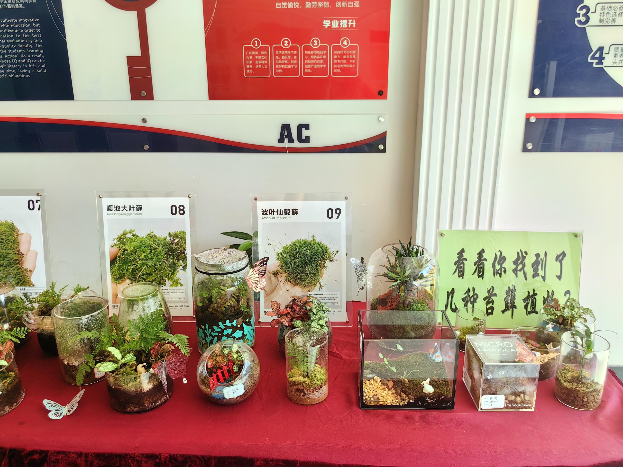 活动筹备环节生物组的老师们紧扣课程标准设计方案,明确跨学科目标与评价标准,反复打磨活动方案,明确跨学科学习目标与评价标准,既保证科学知识的准确性,又兼顾活动的趣味性;以“如何让苔藓存活更久”“怎样设计更美观”等问题引导思考,充分尊重学生创意,让展览既是视觉盛宴,更是育人实践。