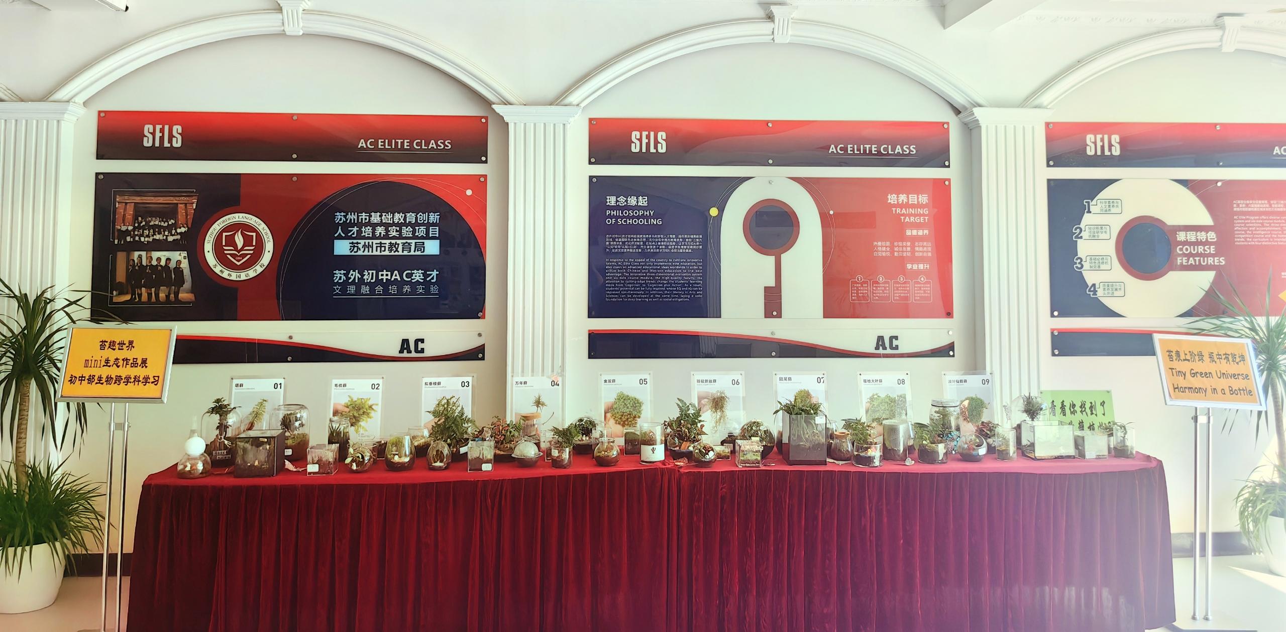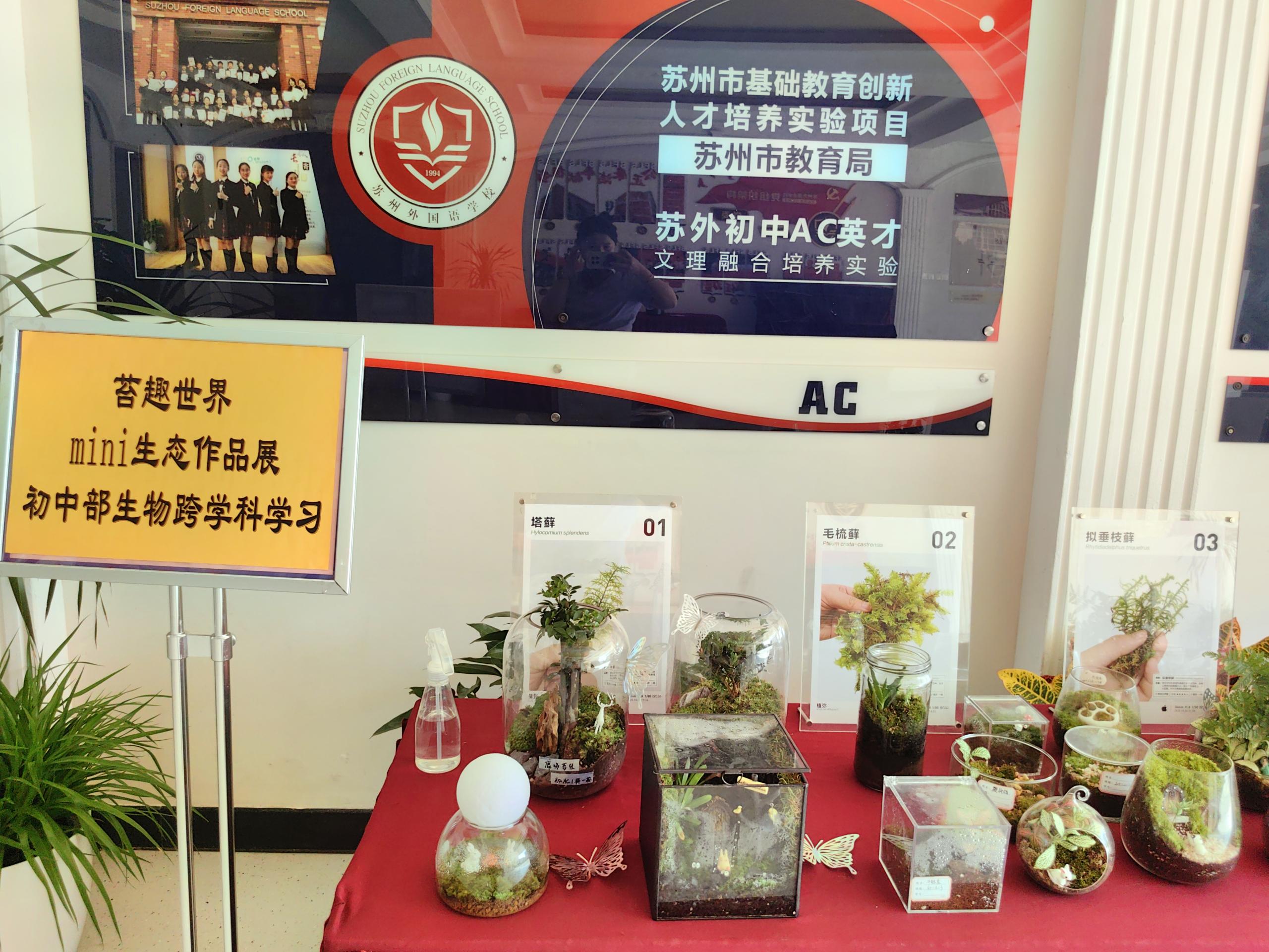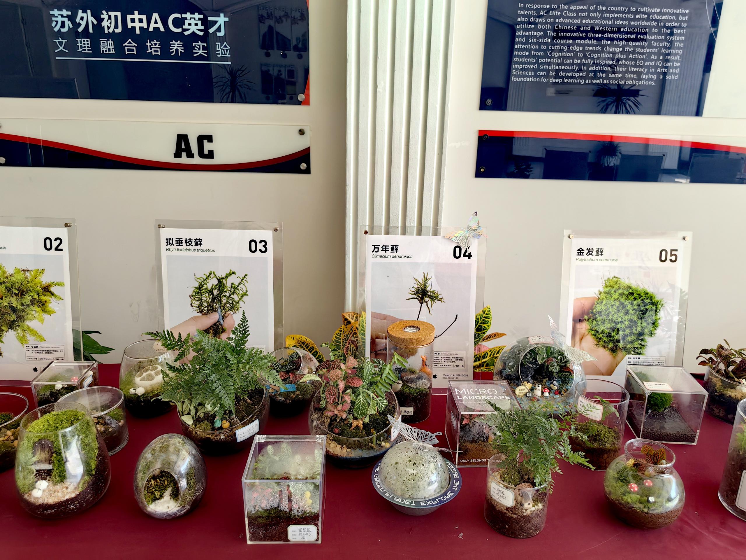 近日,苏州外国语学校初中部行政一楼绿意盎然,生物组策划的“苔痕上阶绿·瓶中有乾坤”(Tiny Green Universe: Harmony in a Bottle)学生mini生态作品展正式开展。瓶中苔藓小森林生机盎然,吸引师生驻足,成为校园里兼具自然意趣与科学温度的风景线。