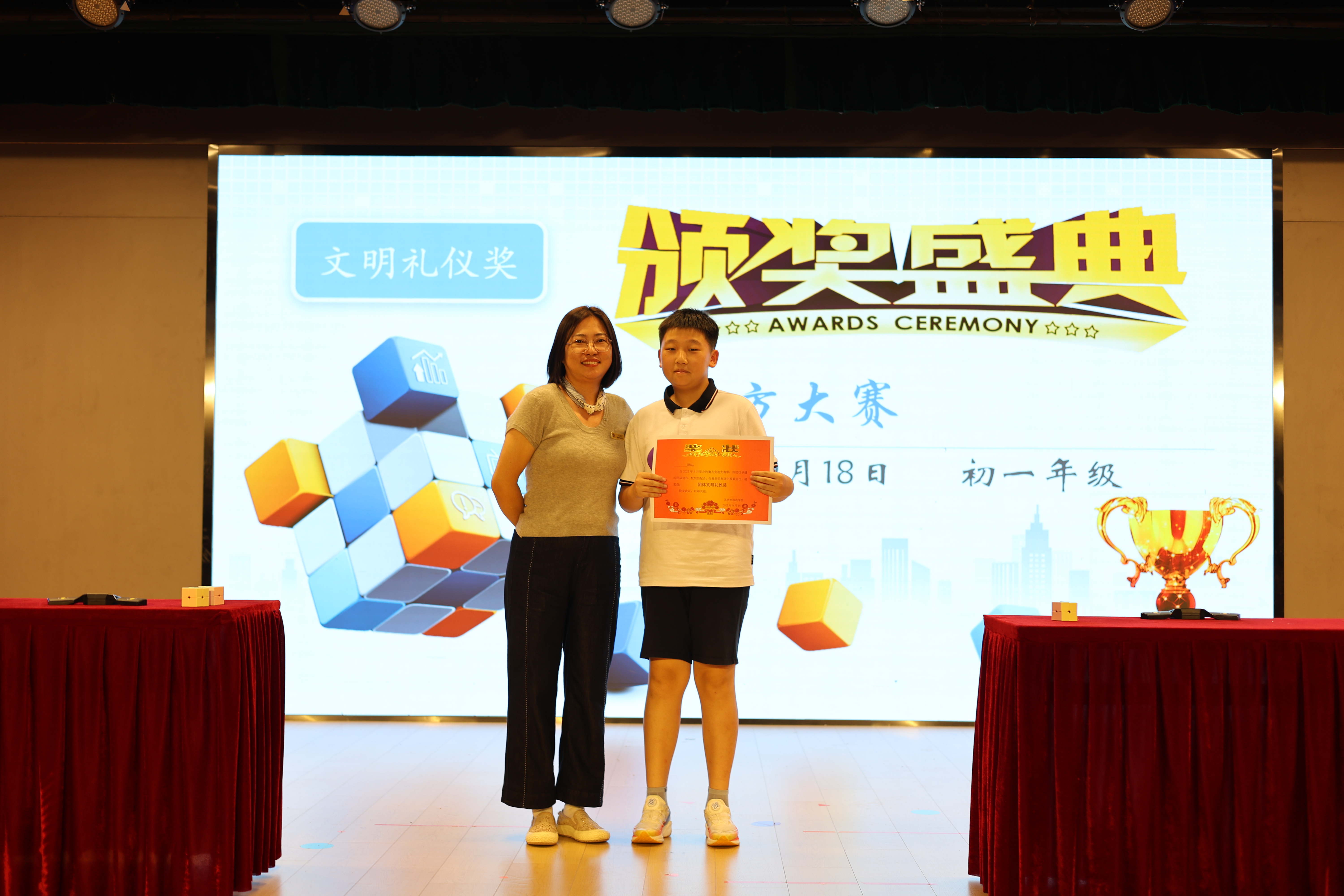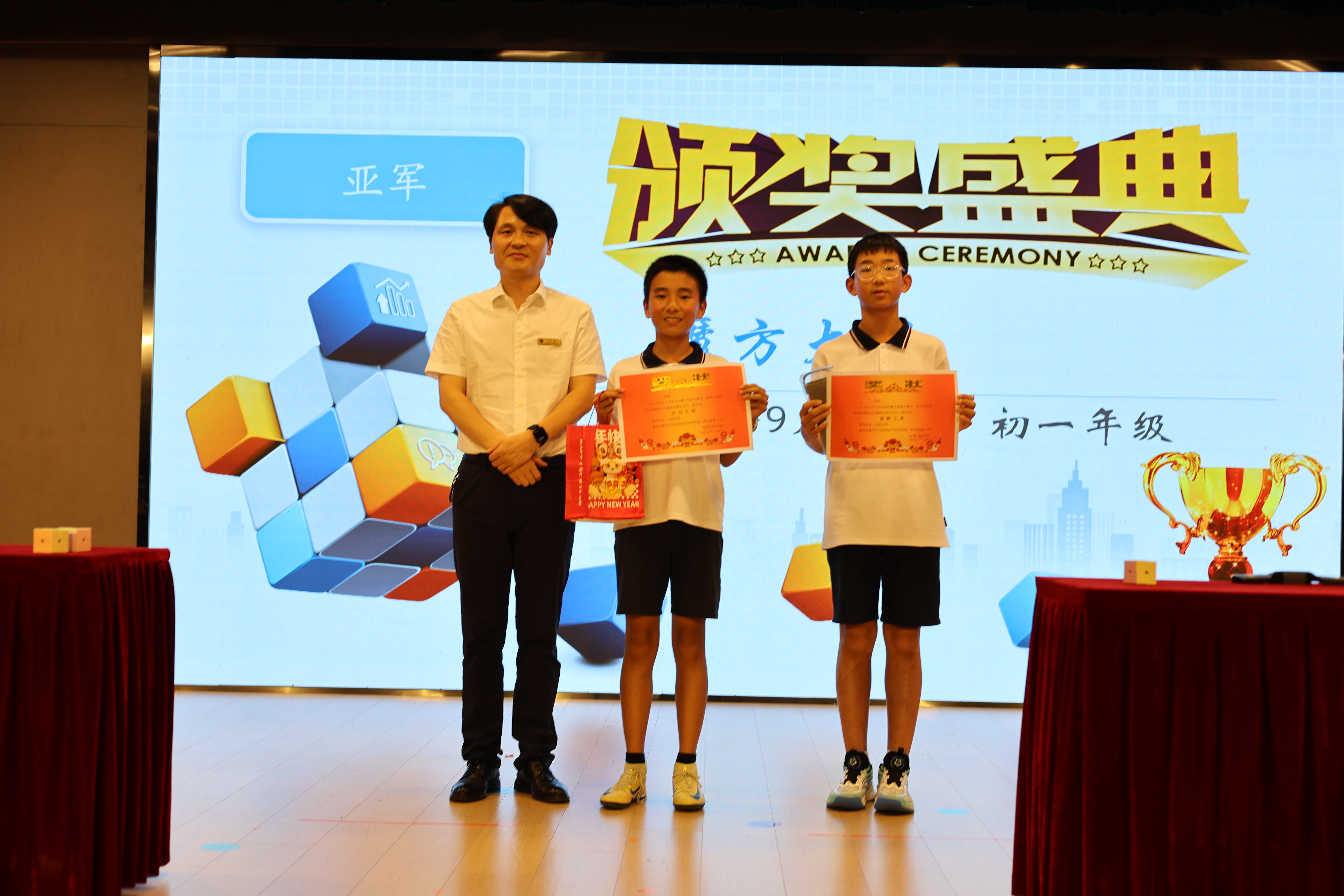 最激动人心的时刻终于来了!个人组季军获得者分别是:7601,7502,7203,7204号选手。7204,7302,7401,7203号选手获得空间大师的称号。使同学们欢呼声最大的时刻必定是颁发“速解之王”奖项的时候,而获得者就是同学们认为的NO.1 7503号吴辰烨选手。获得金字塔魔方比赛的冠亚军分别是7503和7401号选手。除了个人奖项,我们还颁发了团体的奖,而获奖班级分别是:季军:初一(4)班 亚军:初一(2)班 冠军:初一(5)班。同时初一(3)班获得文明礼仪奖,再次向以上同学和班级表示热烈的祝贺!