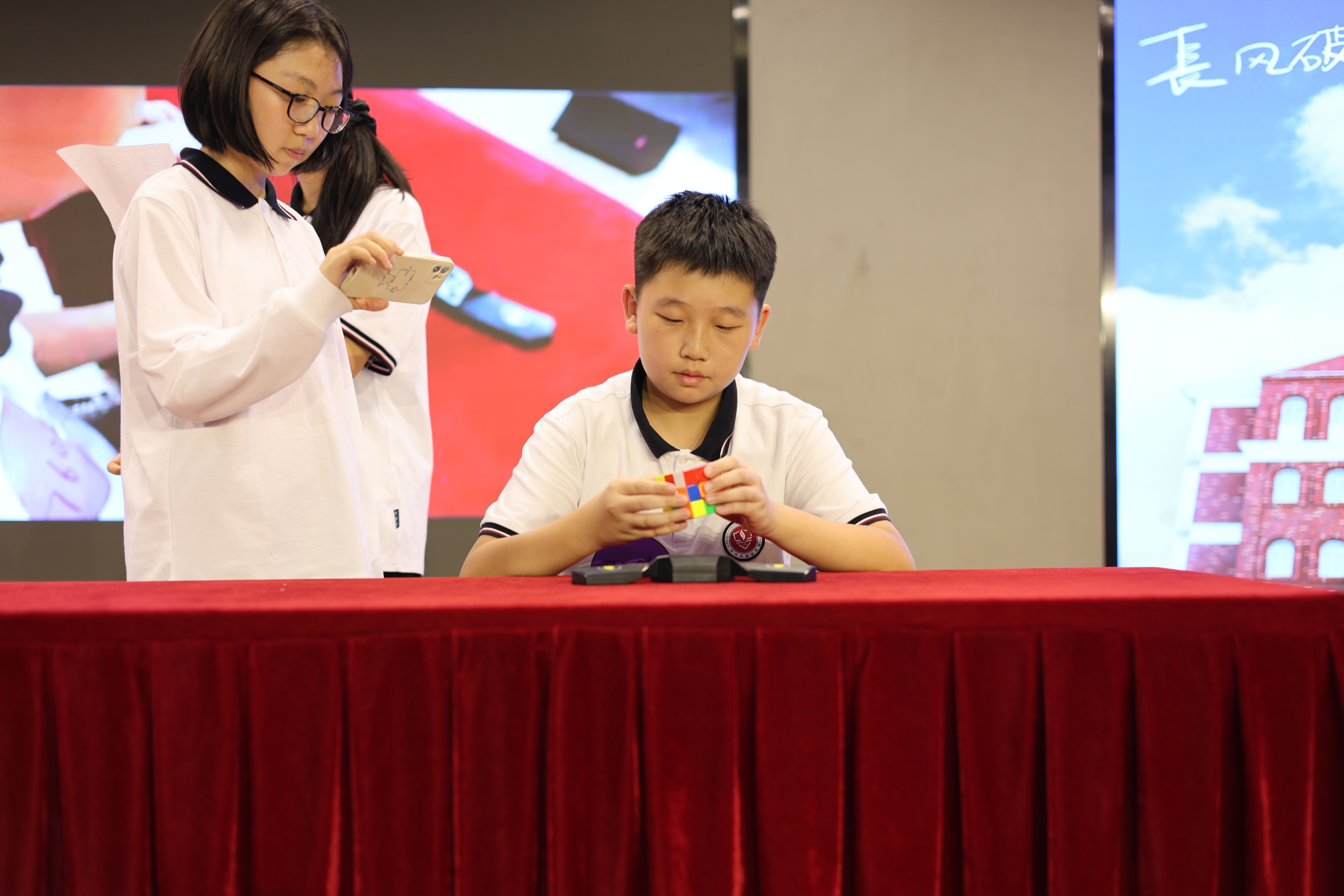 比赛开始之前,高中的学长们为同学们进行了魔方的展示,以增强同学们的自信。学长们以极快的速度完成了魔方的复原,引得台下掌声与欢呼声不断。