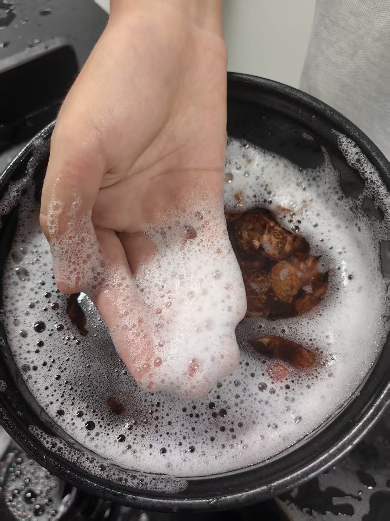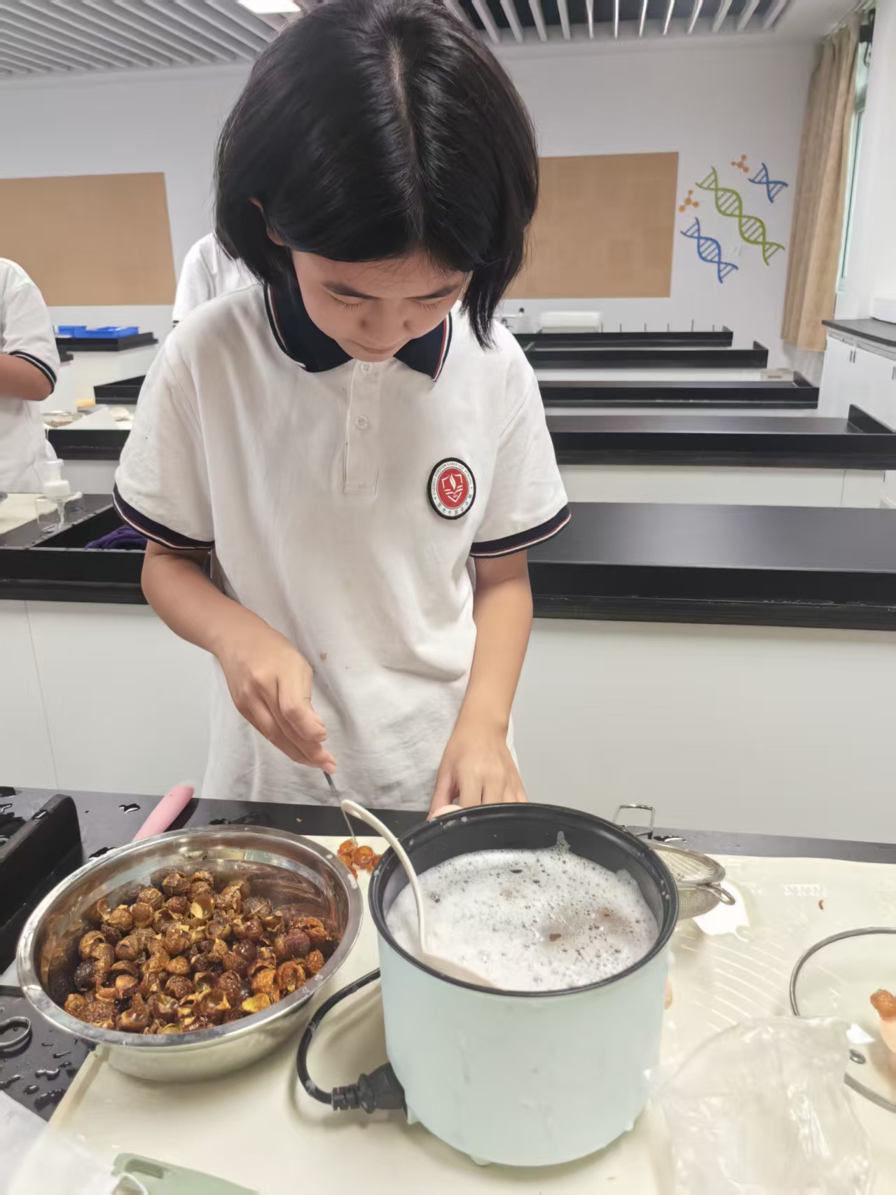 在无患子洗洁精制作环节,学生严格遵循“清洗—熬煮—冷却—装瓶”的步骤开展实践。清洗无患子壳时,泡沫的产生让学生直观感受到天然皂苷的清洁力;熬煮过程中,大家分工协作,细心控制火候以防溢锅,在操作中培养了耐心与专注力。此外,部分孩子还尝试用无患子制作手串,将手工创意与植物资源利用相结合,进一步激发了动手创作的热情。