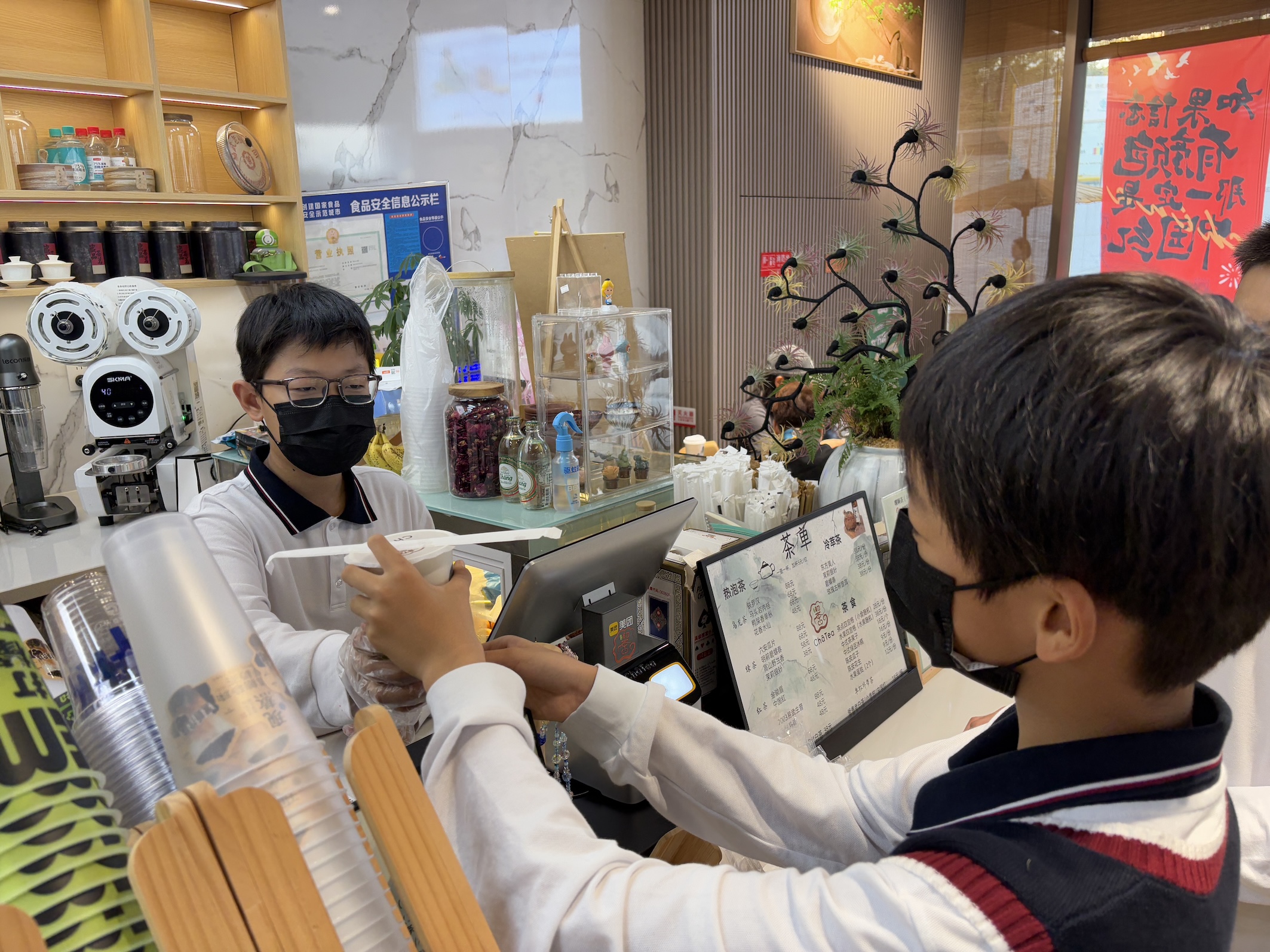 入职培训结束后,孩子们分为四组,在导师的指导下轮流上岗,亲手调配属于自己的原叶现泡鲜乳茶。经过认真学习和不断尝试,孩子们不仅掌握了标准化的制作步骤,还体验到顾客品尝自己作品的成就感。