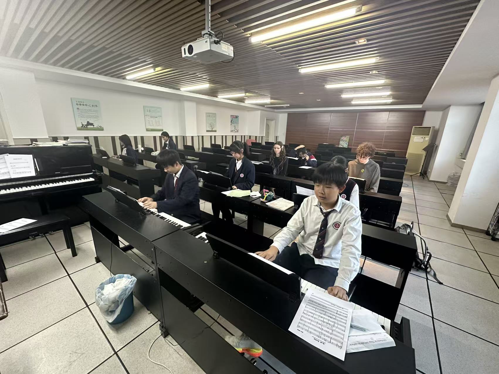 在核心的演奏学习环节,7节课程的打磨让同学们逐步突破演奏难点。大家先从和弦体系入手,系统学习Rootless voicing(无根音伴奏)技法,对比无根音和弦与带根音和弦的弹奏差异,反复练习指法编排与和声连接;再结合爵士风格的旋律特点,尝试将分解和弦与音阶融入演奏,在琴键上摸索即兴表达的规律。跨文化的音乐交流更是课程的亮点,与德国学生联动体验Afro节奏时,同学们通过非洲鼓的节奏律动,理解爵士音乐中节奏基底的重要性,让演奏的层次感与趣味性进一步提升。