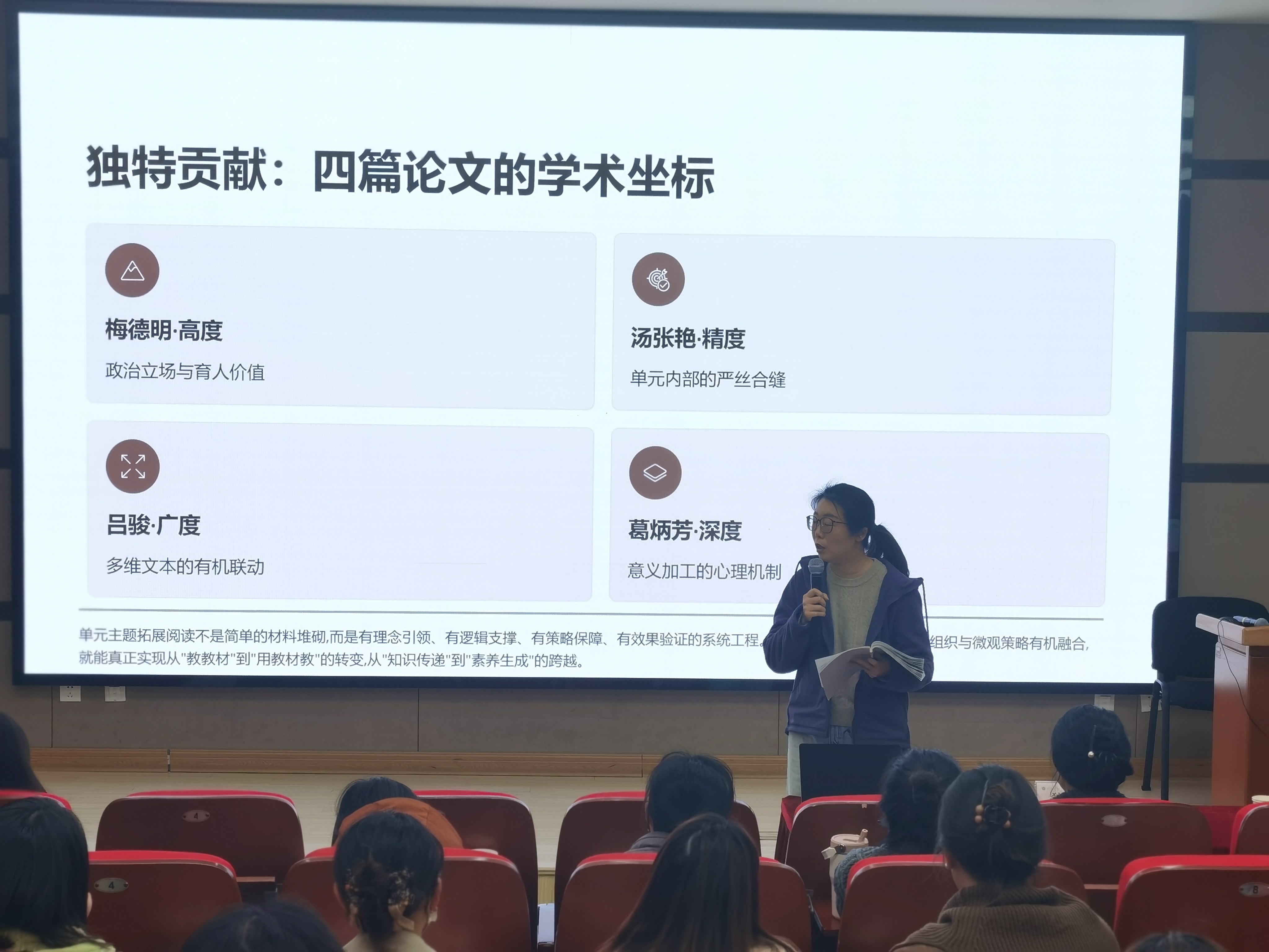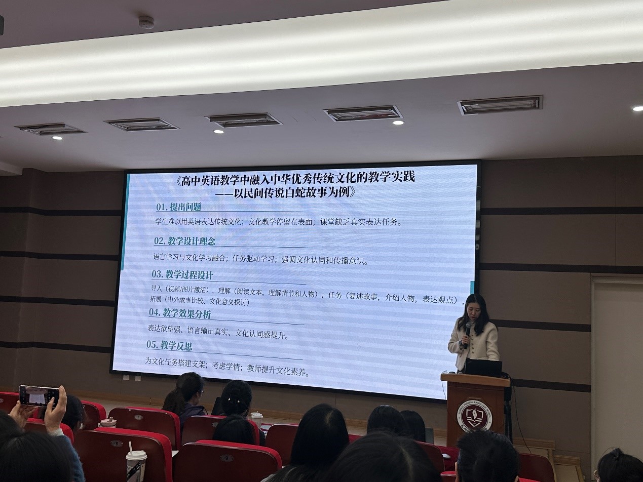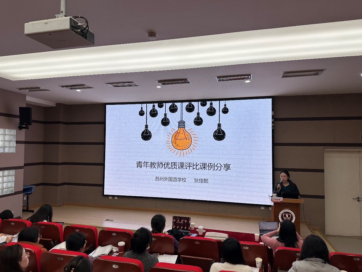 活动最后,江苏省优质课一等奖获得者狄佳懿老师作专题分享。她结合自身参赛课例,以“理念为灯塔、主线为脊梁、细节定精彩、学生为中心”为主题,生动阐释了一节好课的构成要素,为在座教师提供了宝贵而具象的专业示范。