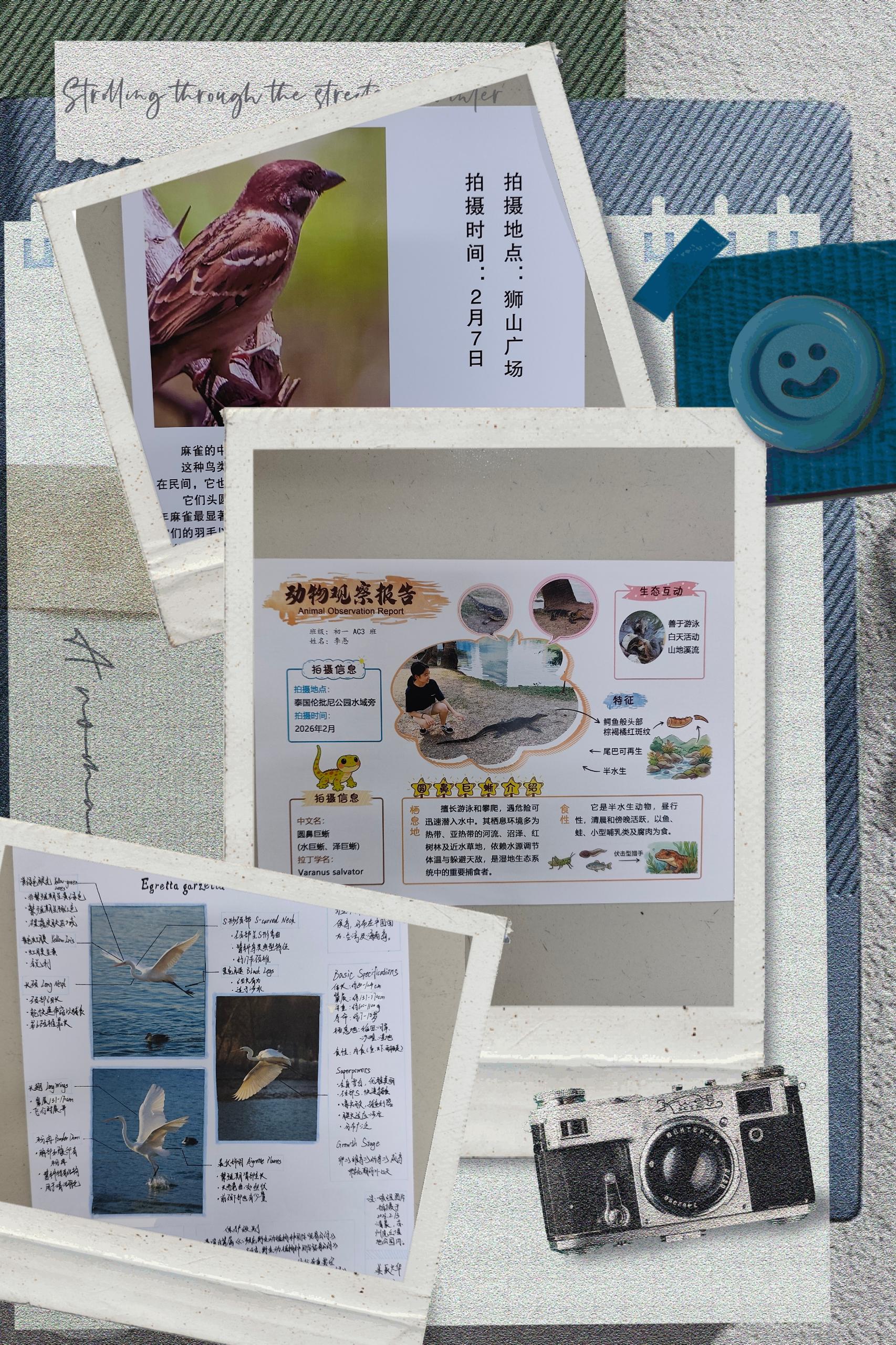 本次活动要求学生走进公园、小区、郊外等自然场景,拍摄陆生、水生动物清晰照片,精准查阅资料标注中文名与规范拉丁学名,结合所学知识撰写包含形态特征、生活习性、栖息环境的科学说明。活动中,同学们严格遵守保护动物的原则,细心观察、严谨记录,用镜头捕捉麻雀、蝴蝶、蟾蜍、松鼠等常见动物的身影,将课本知识与自然实践深度结合。