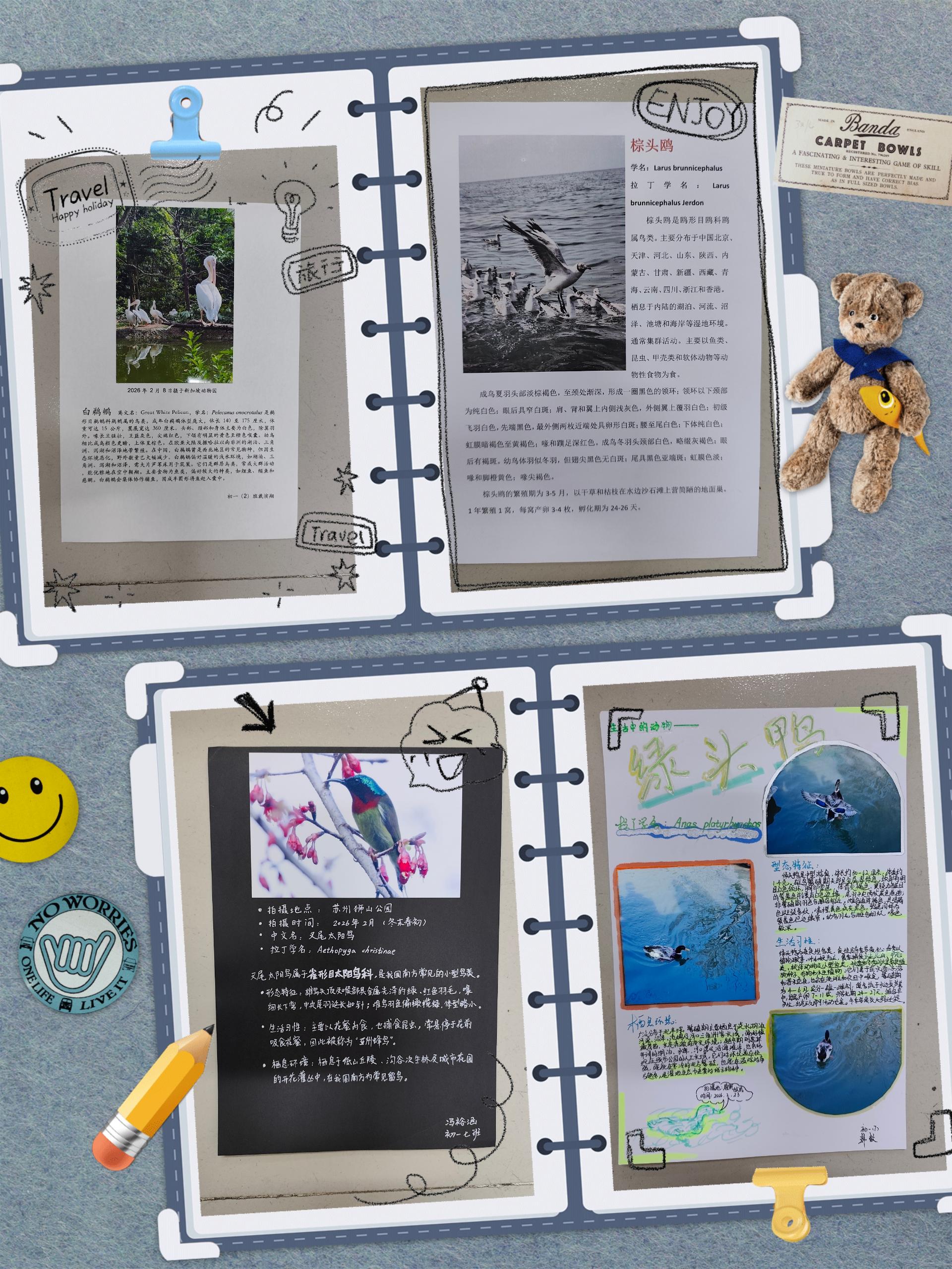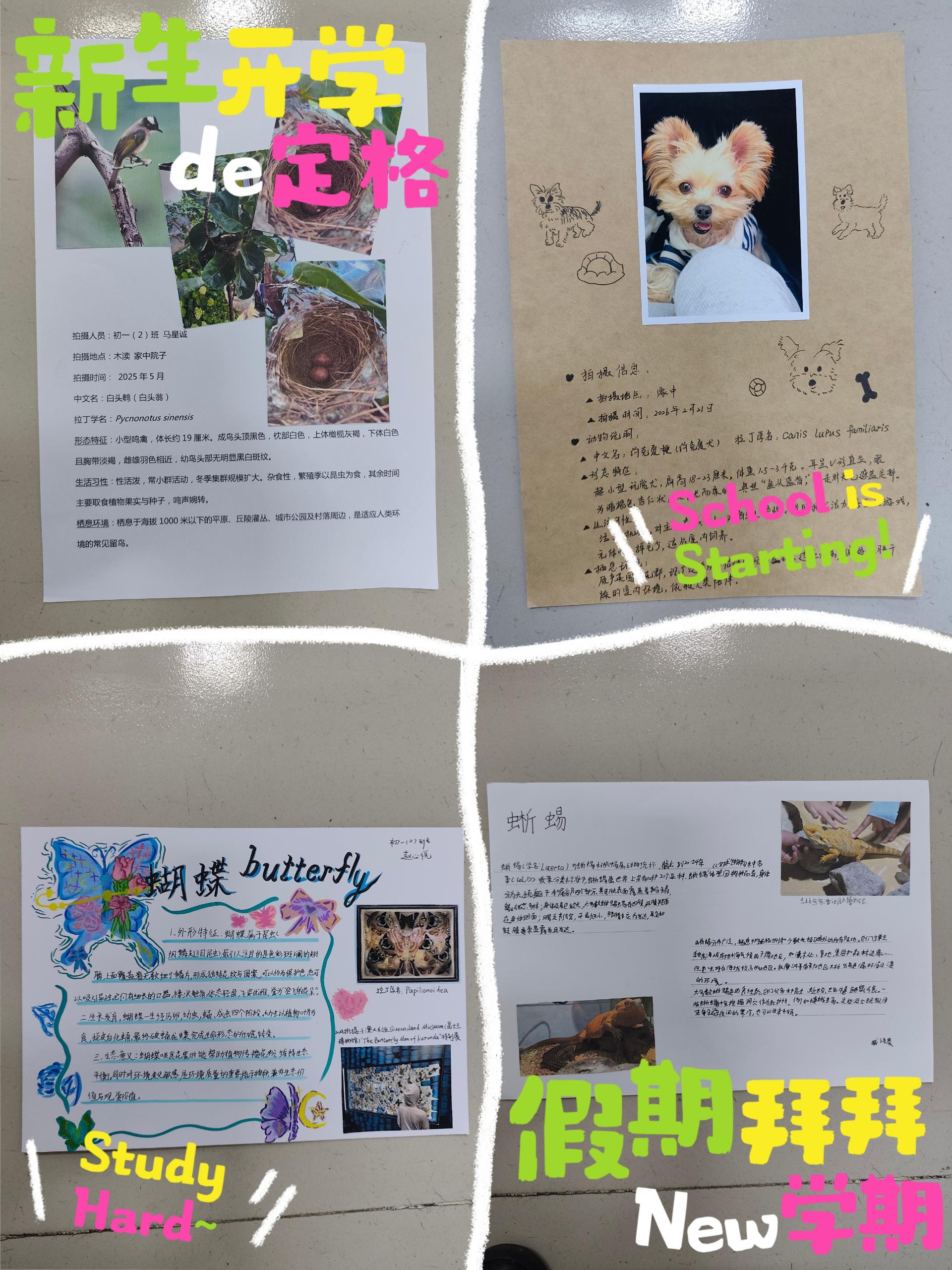 在实践过程中,同学们收获满满、感悟深刻。初一(3)班李承泽分享道:“这次活动让我走出了课本,在小区里观察到了平时忽略的菜粉蝶,查资料学会了写它的拉丁学名,还理清了它的变态发育过程,原来生物知识就在我们身边,特别有意思!”初一(5)班高之周则表示:“我在郊外池塘观察了黑斑蛙,通过查阅专业图鉴,准确记录了它的形态和栖息环境。这次实践让我明白了科学观察需要严谨认真,也让我更加懂得要保护小动物,守护我们的生态环境。”初一(6)班王若雅说道:“从拍摄照片到整理资料、撰写说明,每一步都让我学到了很多。看着自己完成的观察作品,特别有成就感,也让我更加热爱生物这门学科。”