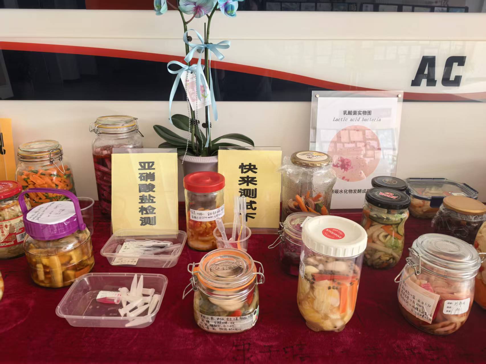 活动现场,人头攒动,热闹非凡。在各式各样的成果展台上“泡菜亚硝酸盐含量检测”与“pH值检测”体验区成为全场瞩目的焦点。同学们将自己亲手制作的泡菜带到现场,利用专业的检测试纸和比色卡,对其发酵过程中的关键指标进行“体检”。“大家快来看,我们组腌制的泡菜现在pH值已经降到3.0以下,亚硝酸盐含量也迎来了‘安全转折点’!”一位正在引导参观者观察色卡对比的学生讲解员自豪地介绍道,孩子们在亲手操作中理解了食品安全的重要性,明白了“泡菜何时食用最安全”这一生活常识背后的科学原理 。