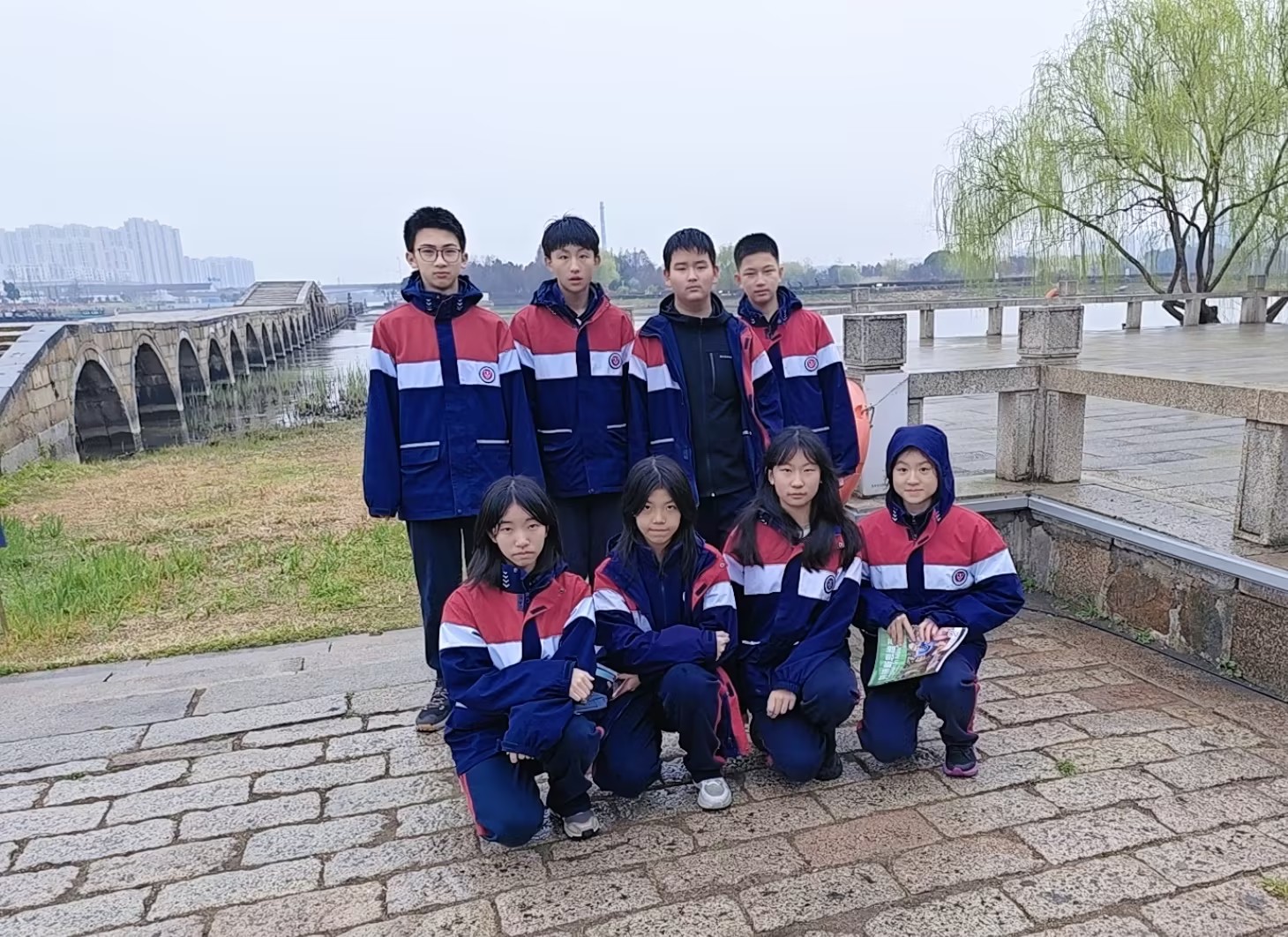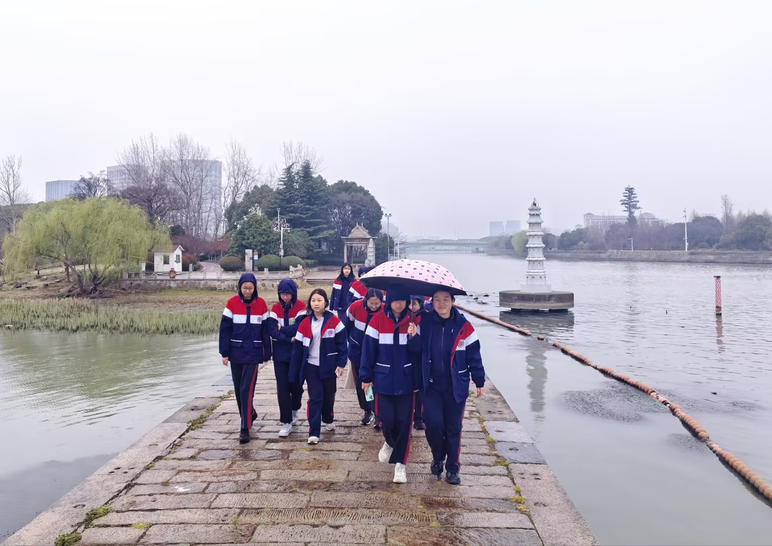 当日14:45,参与研学的同学们准时集结于校门口,怀揣着对古桥文脉的向往与探究的热忱,有序登车,奔赴本次研学的目的地——宝带桥。这座静卧于澹台湖口的古桥,是中国大运河上一颗璀璨的明珠,亦是中国现存古代桥梁中最长的多孔石桥。自唐代始建以来,它历经千年风雨侵蚀、岁月沧桑,依旧雄姿不改,承载着厚重的吴地文脉与运河记忆,成为本次研学活动最具分量的探索载体。