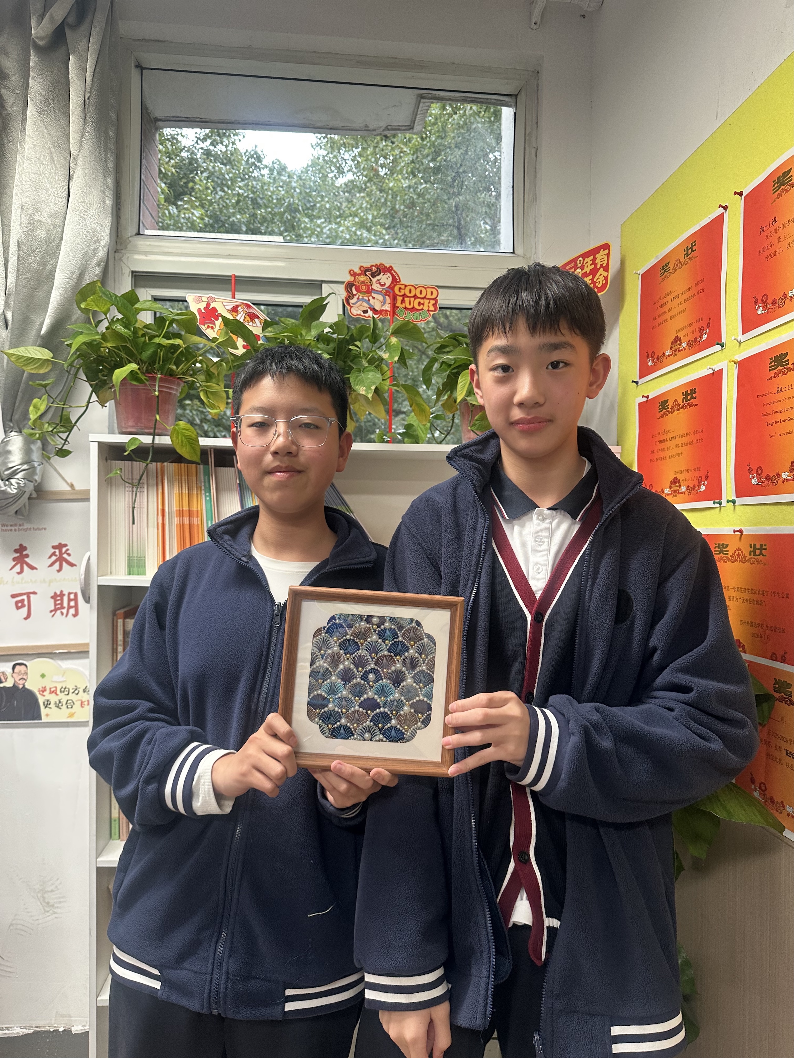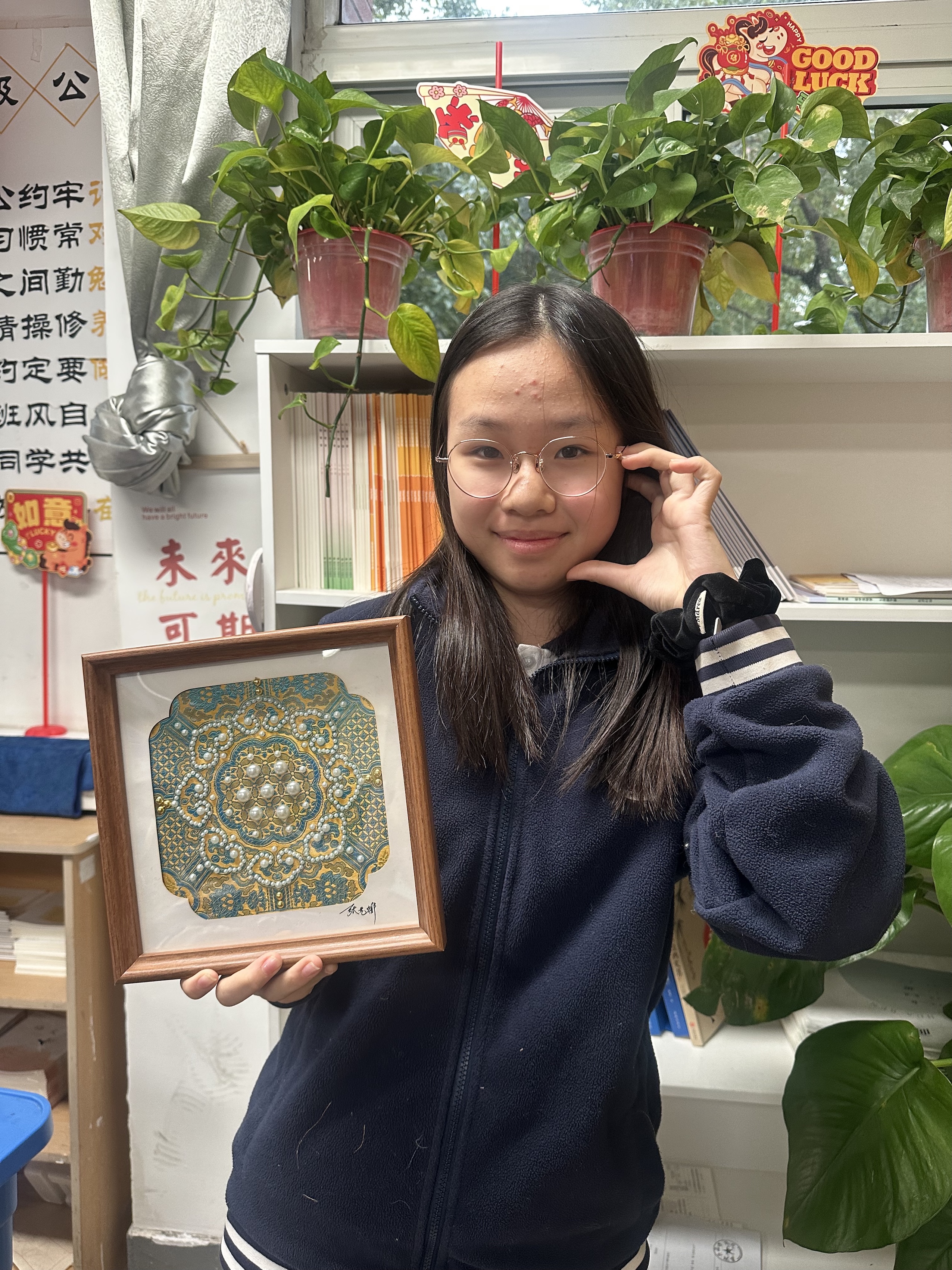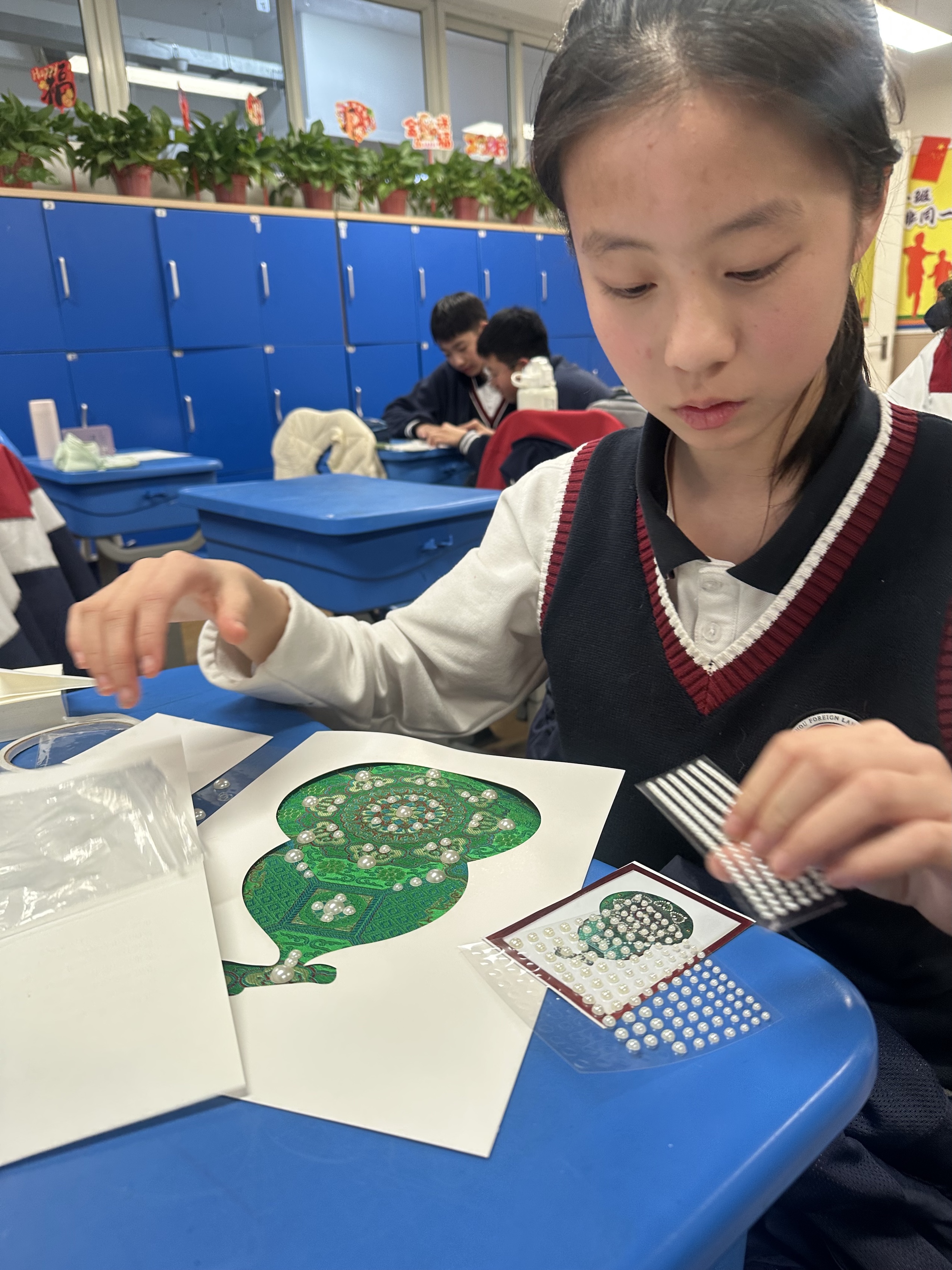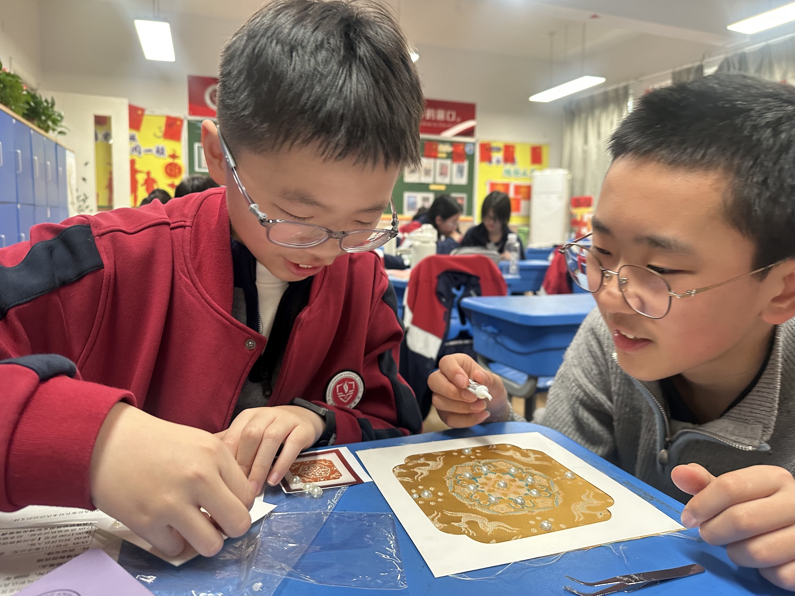 课堂上,老师带领同学们走近苏州非遗宋锦,讲解其历史渊源与纹样美学,宋锦匠人钱小萍的坚守故事,更让大家对非遗手艺人的职业精神心生敬佩。创作环节,同学们化身小小非遗手艺人,端详宋锦纹路构思布局,小心翼翼粘珠固定,每一步都凝神聚力。遇到粘贴不牢、布局不协调等问题,大家互相探讨、反复尝试。有同学感慨:“简单的粘贴却需要十足耐心,终于体会到传统手艺人追求极致的不易。”当融合宋锦之美与创意的珍珠画完成,同学们的脸上满是成就感。