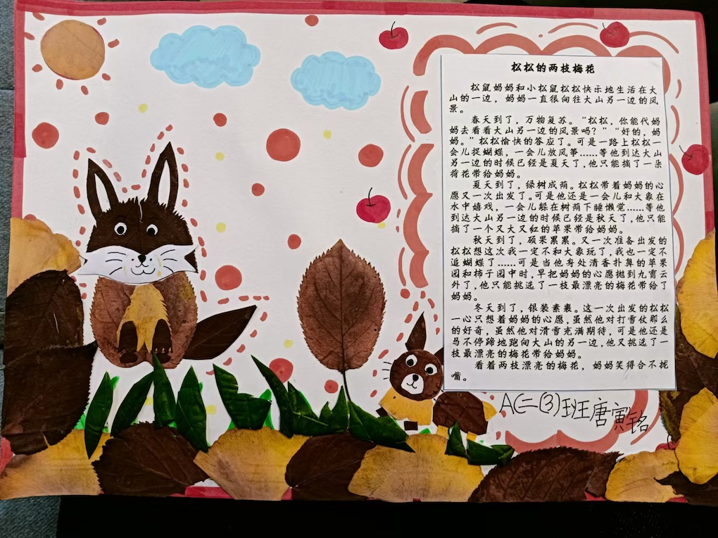挖掘主题实践体验活动的各类资源,孩子、家长和老师们在丰富多彩的活动中体验生活、提升综合实践运用的能力,感受童年的多姿多彩。我们就运用书本上学到的好的句式范例来仿写,孩子们纷纷用拼音、画图、不断积累的汉字在我们专用的《读写绘》小本子上我手写我心,记录我们自己身边的精彩生活和美妙体验。我称之为“用数学例题引路”的方式来指导低年级孩子写话,孩子们每周都有佳作涌现,童言稚语创作热情特别高。本学期发表优秀佳作6篇,获奖佳作十余篇。本期我们把学科融合与“我写我画”比赛相结合,创作树叶贴画和创编童话故事。初冬,素有苏州“小九寨沟”之称的白马涧色彩斑斓、层林浸染。红橙黄绿青蓝紫,如打翻了颜料罐泼洒出肆意的油彩画卷,我们爬山、赏景、听《卧薪尝胆》的故事、捡各种颜色形态各异的落叶。语文写话课上,我指导孩子们展开想象,创编美好有趣的童话故事。
