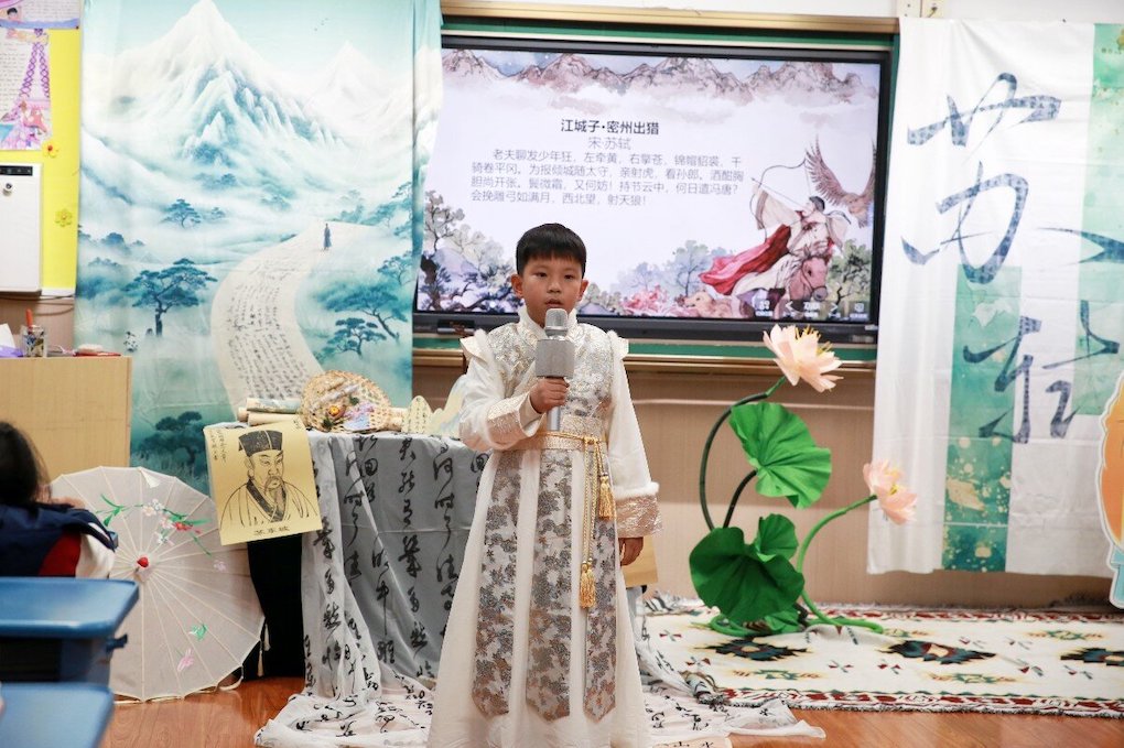 走过春夏秋三季,我们来到了深沉而含蓄的冬天。利用晚课时间,AC三3班师生以及部分家长代表济济一堂,共同迎来班级每学期一次的书香汇报演出。此次我们的阅读主题是“东坡诗词朗诵会”。这学期,我们是书本中接触了苏轼的两首诗。全班每月必读一本书,其中就有《少年读苏东坡》。于是,孩子们走近这位中华文学史上耀眼的星星,领略他过人的才华和豁达的胸襟,以及心怀天下的奇才。