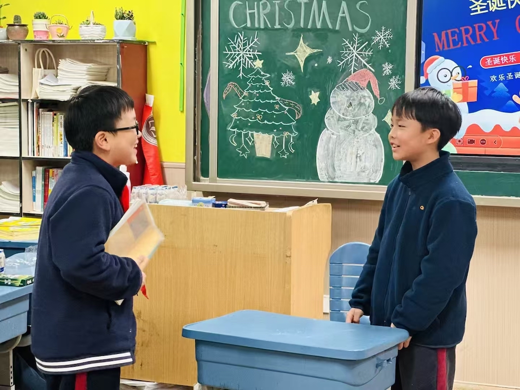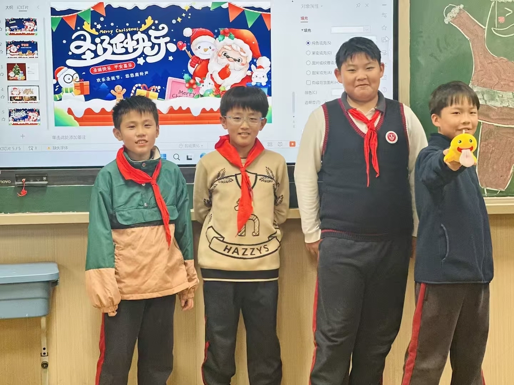 12月24日晚课时,五3班教室洋溢着节日的氛围,一场以“欢乐圣诞节 悠悠鹿铃声”为主题的迎新活动精彩上演。英语老师Miss杨通过家长群实时直播了孩子们的节目表演,吸引了全班师生及家长们的热切关注。