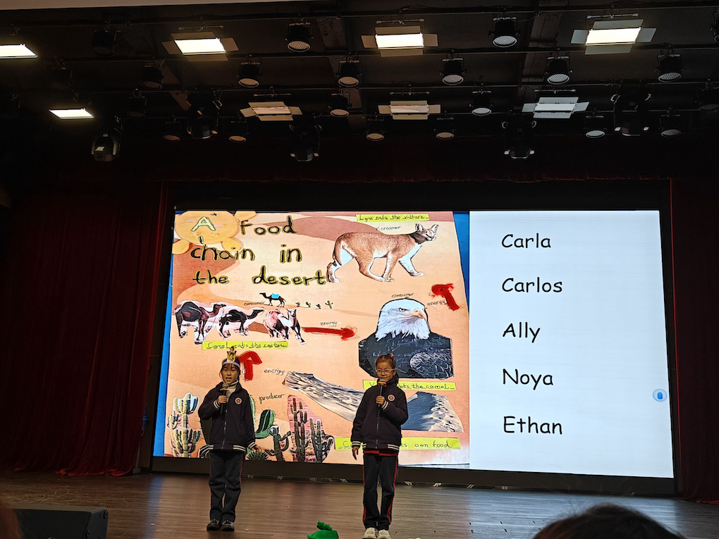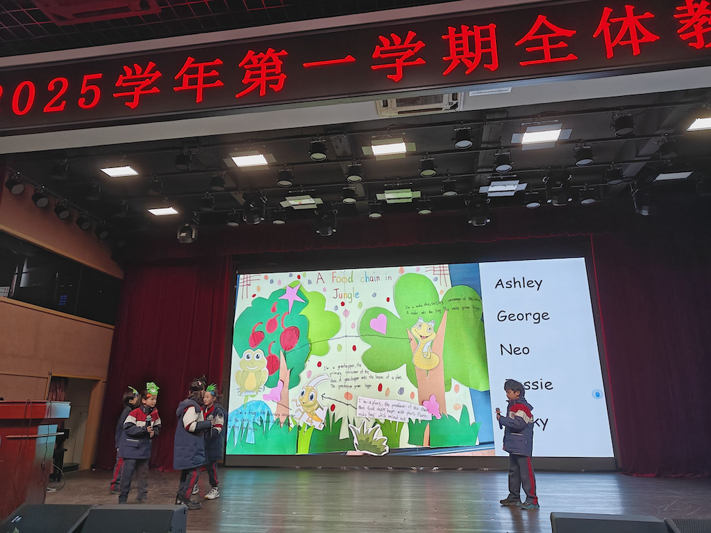 汇报当日,校园热闹非凡。外教邀请家长走进校园,共同见证孩子们的成果。舞台上,六组孩子各展风采。有的小组以灵动表演还原丛林食物链的弱肉强食;有的用草原描绘北极动物在冰原的生存图景。孩子们将丰富想象与扎实知识融合,带来精彩演出。