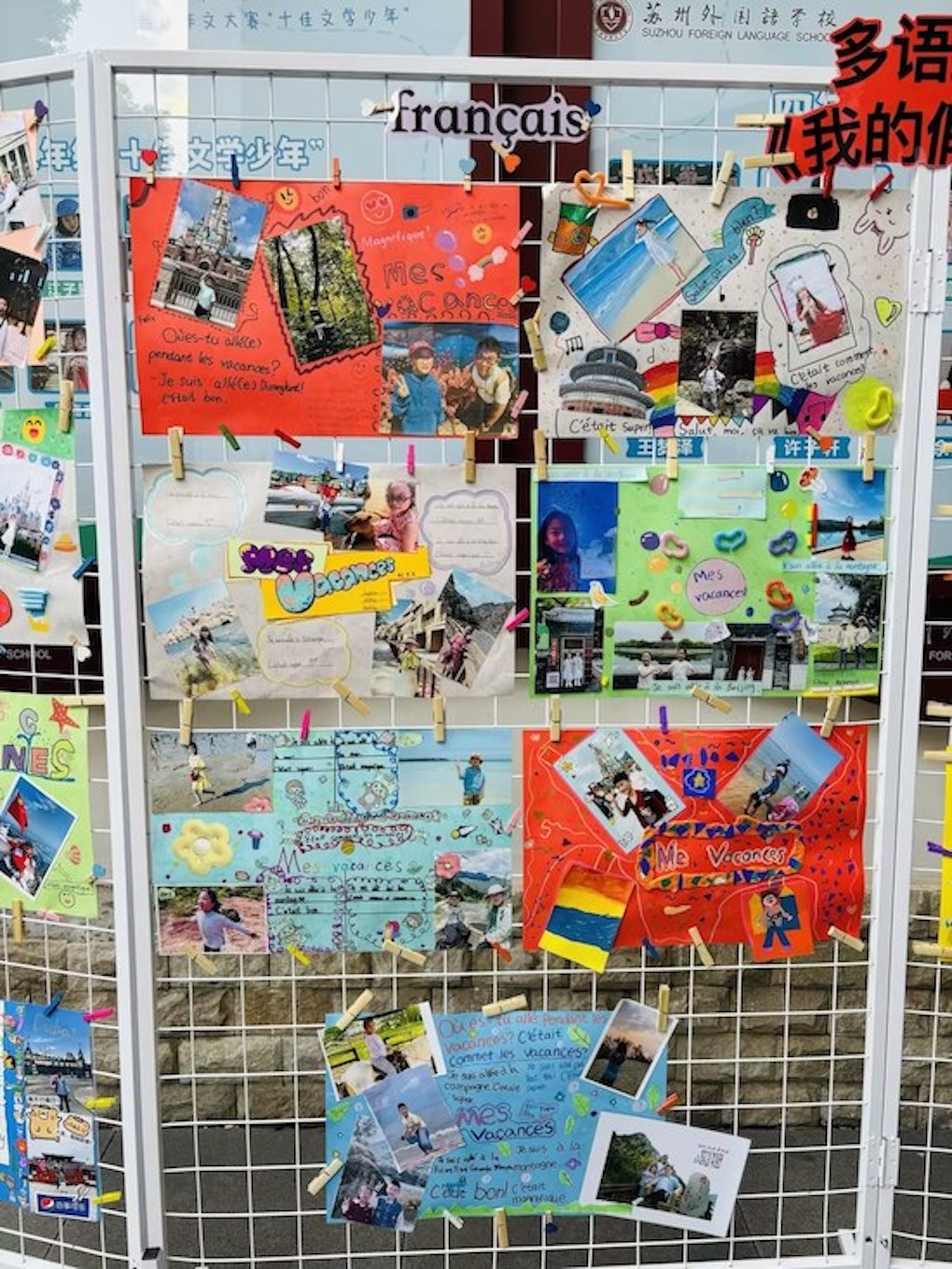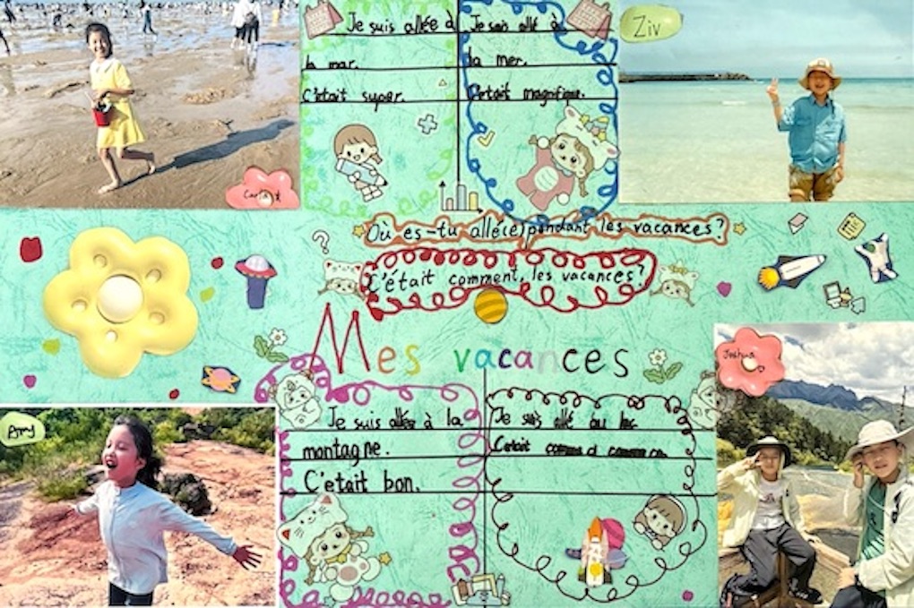 《我的假期》主题,孩子们分小组合作手绘假期海报,并在小学部进行了展出。色彩斑斓的法语海报展现了自己缤纷的假期生活,充满了假期的欢乐和创意,吸引了众多师生的目光。