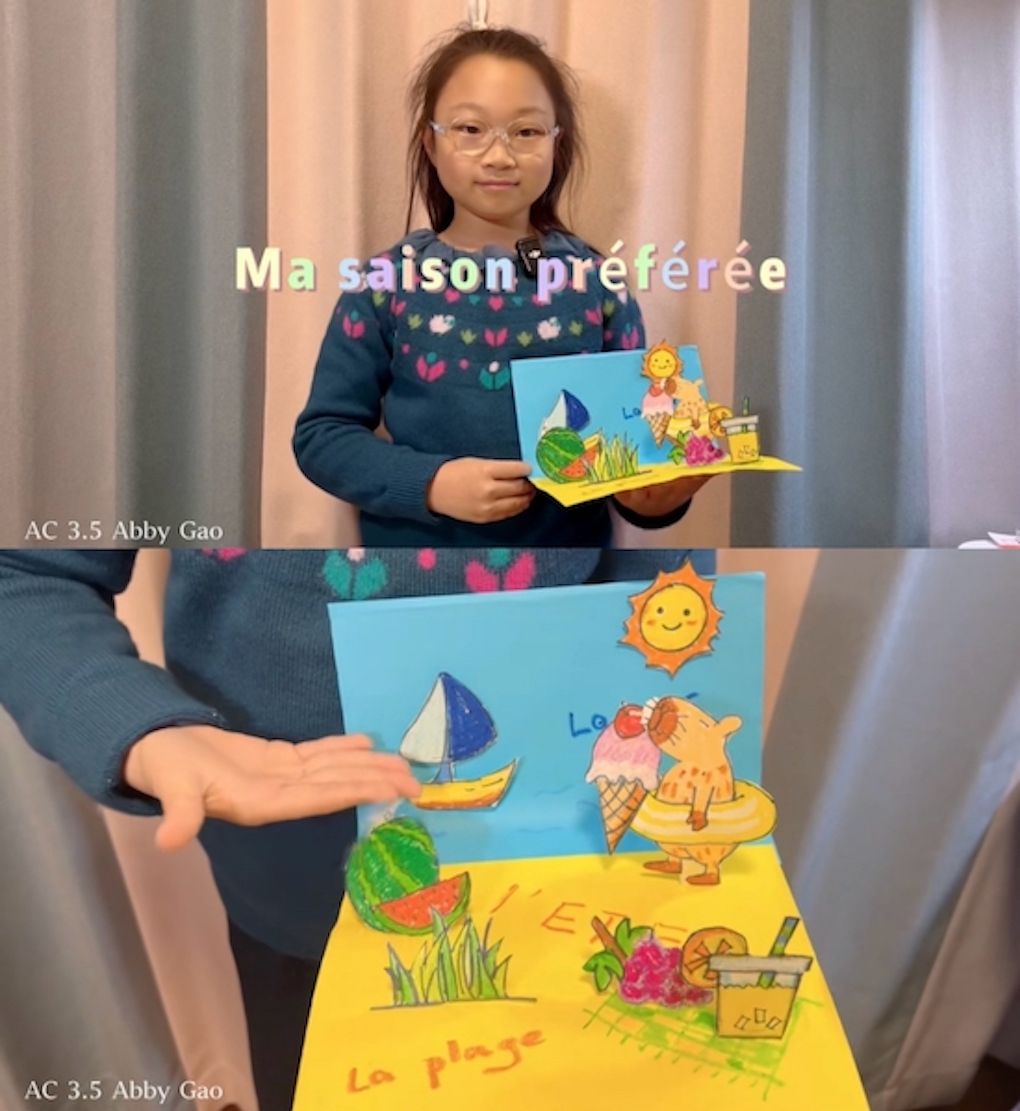 在《四季与天气》主题活动中,学生们展开丰富的想象力,手工绘制了自己心中“最喜欢的季节”。他们的作品形态各异,风格多样,配合流利的法语介绍,充分展现了他们对四季的独特理解和艺术创造力。