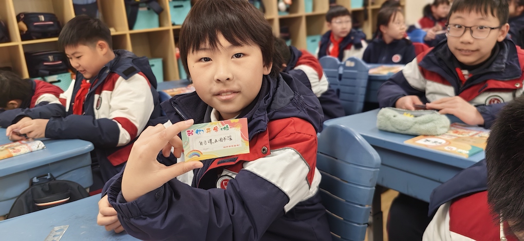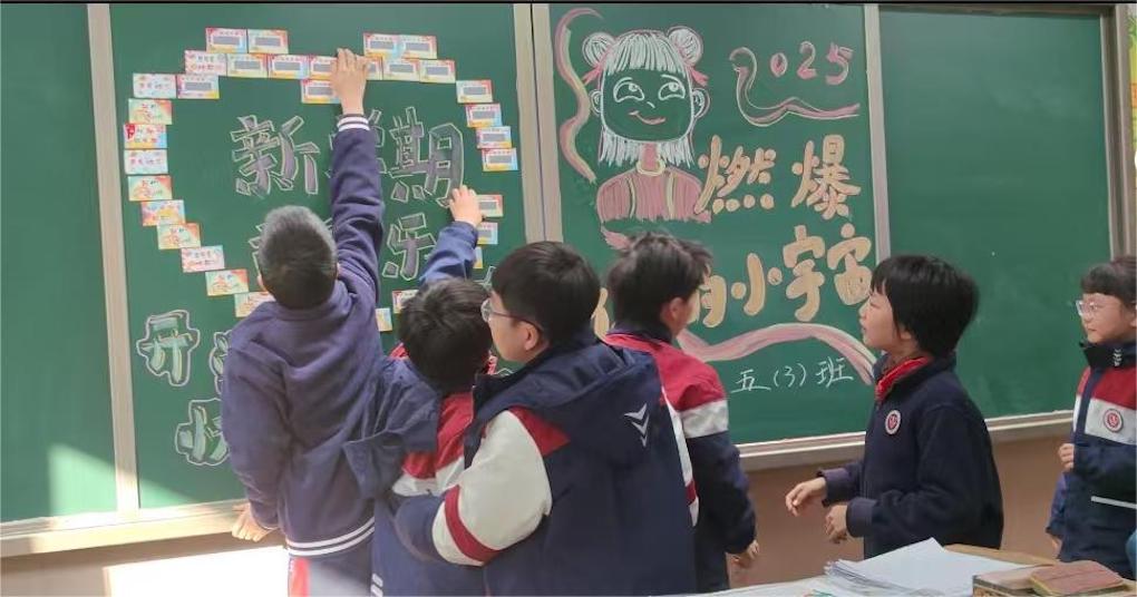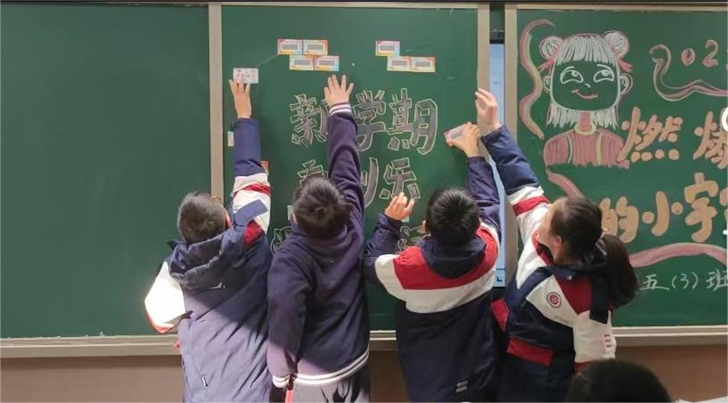 开学第一天早晨,五(3)班的教室里热闹非凡。黑板上36张新学期加油卡贴成一个爱心形状,班主任丁老师站在讲台上,笑眯眯地望着台下叽叽喳喳的同学们。“同学们,新学期新气象,老师准备了一份特别的礼物——‘新学期刮刮乐’!”丁老师指着黑板说到,“每个人都能抽一张,看看会给自己带来什么惊喜。”