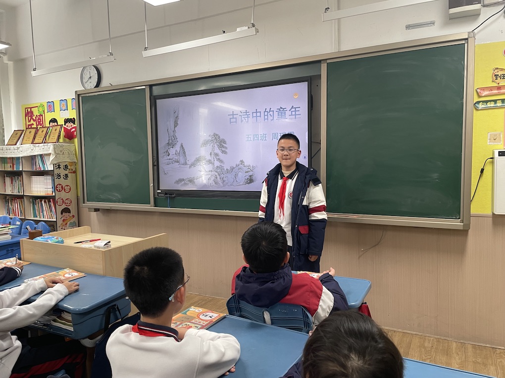 在历史的长河中,诗人如天空中的星辰,发出耀眼的光辉。他们以自身与众不同的魅力,崇高而伟大的人格,给我们留下了许多经典的诗篇。五(4)班一场别开生面的主题班会——《古诗里的童年故事》在这里拉开了序幕。同学们通过对经典古诗的诵读、解读、演绎,赢得了台下的阵阵掌声。一篇篇经典佳作,在同学们的精心制作下,如歌如画。短短一节课,同学们一起重温古诗之意,分享诗词之美,感受诗词之趣,从古人的智慧和情怀中汲取营养,滋养心灵,享受了一场精神盛宴。