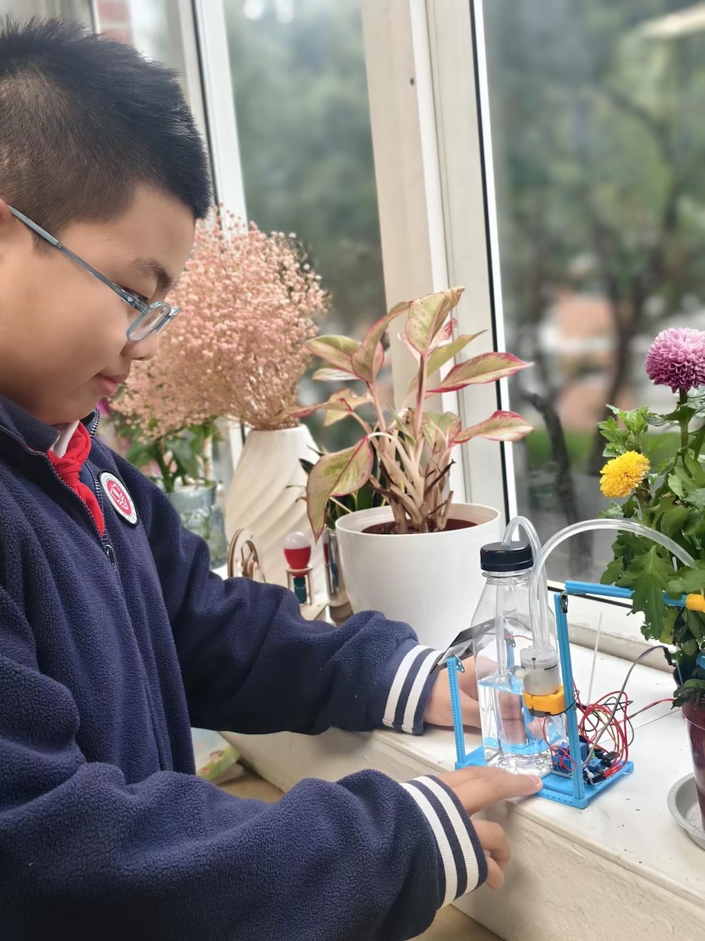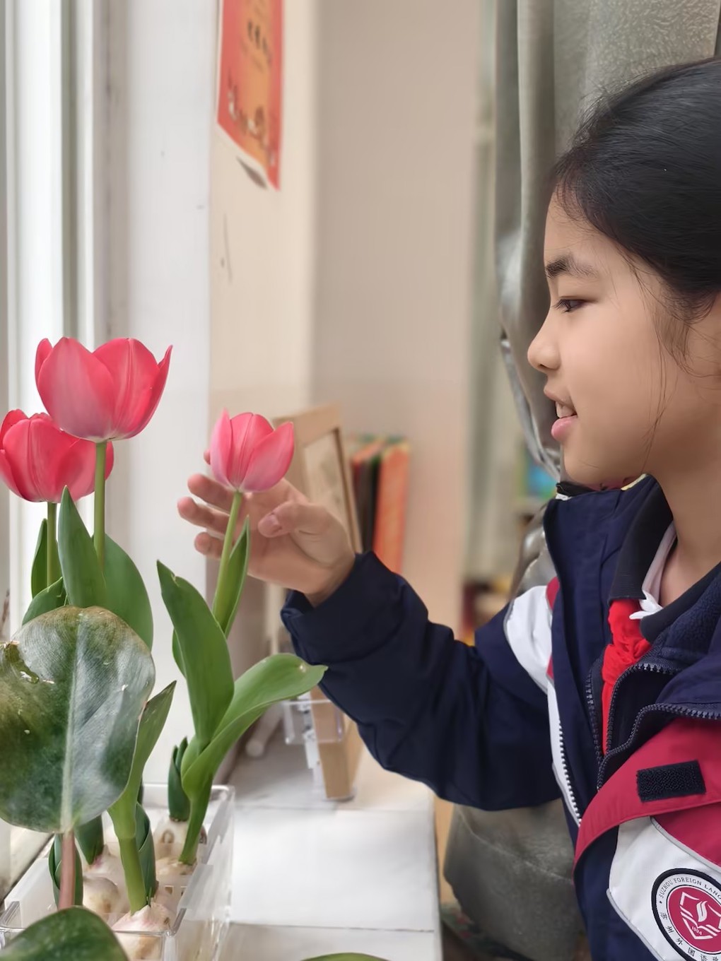 有时同学们会轻步走进绿植的世界。香樟树如同一位历经沧桑的长者,郁金香则似少女般娇艳欲滴。微风拂过,香樟散发出阵阵沁人心脾的清香,郁金香则摇曳生姿,令人心旷神怡。这样的美景,让学生心灵得以小憩。