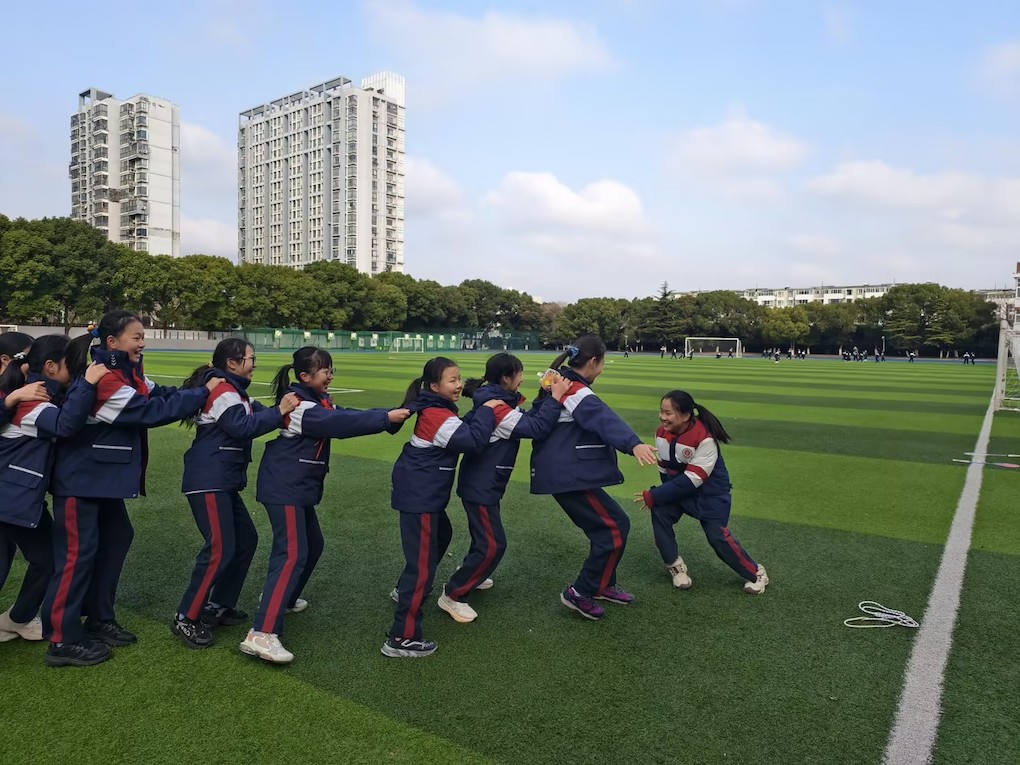 AC五年级二班的同学们有时会上演一场激烈的"老鹰捉小鸡"游戏。一串银铃般的惊笑正在抽枝发芽。老鹰张开双臂化作流云,在“鸡群”翻涌的麦浪间穿梭,稚嫩的手掌串联成起伏的藤蔓,每一次躲闪都抖落晶莹的汗珠。风追着翻飞的衣角跑过草坪,把“抓到啦”的欢呼送上树梢,惊醒了打盹的麻雀,扑棱棱驮走一捧清亮的童年。