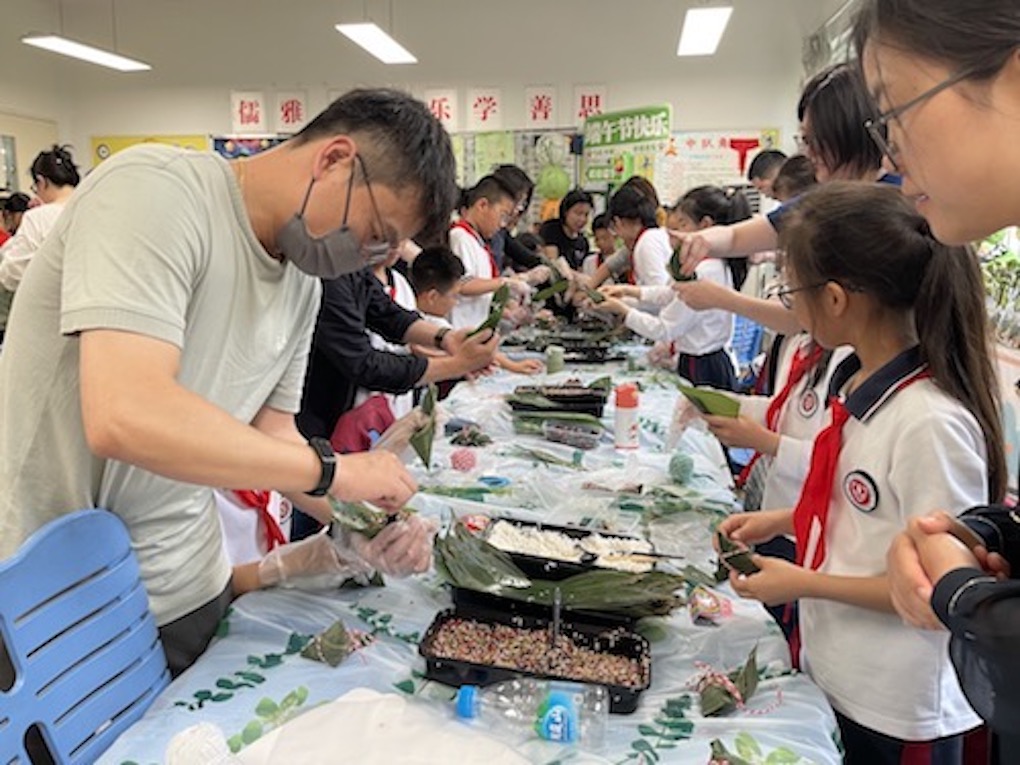 随后,最受期待的亲子包粽子活动将现场氛围推向高潮。活动现场为大家准备了充足的糯米、粽叶、馅料和棉线等材料,还安排了指导小组进行示范教学。在60分钟的时间里,家长和同学们齐心协力,共同动手。尽管包粽子的过程并不轻松,粽叶在手中不太听话,糯米也偶尔“调皮”地漏出,但大家相互学习、彼此帮助,欢声笑语回荡在整个场地。最终,桌上摆满了各式各样、饱含心意的粽子 ,这些粽子不仅是美食,更是亲子间合作与亲情的见证。活动还设置了“巧手包粽”比赛,根据粽子的造型美观度和数量评选出优秀亲子组合并进行表彰,进一步激发了大家的参与热情。