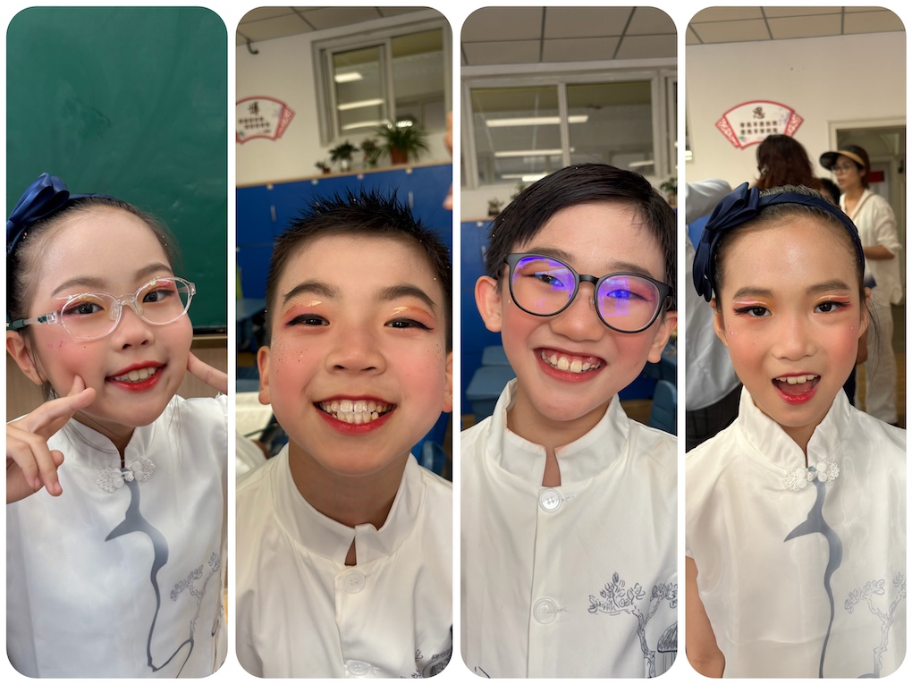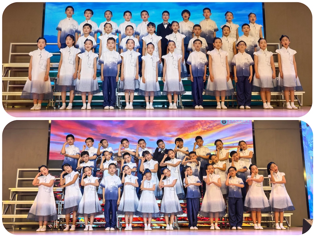 5 月 22 日下午,苏州外国语学校小学部的舞台上流淌着温暖的旋律。AC 三(1)班 30 名孩子身着水墨画风格的服装,以一首《光亮》拉开了关于勇气、成长与传承的音乐序幕。在音乐老师朱靖的悉心指导与家长志愿者杨義妈妈的戏腔雕琢下,孩子们用纯净童声作笔、灵动姿态为墨,在舞台上勾勒出属于童年的璀璨光谱。