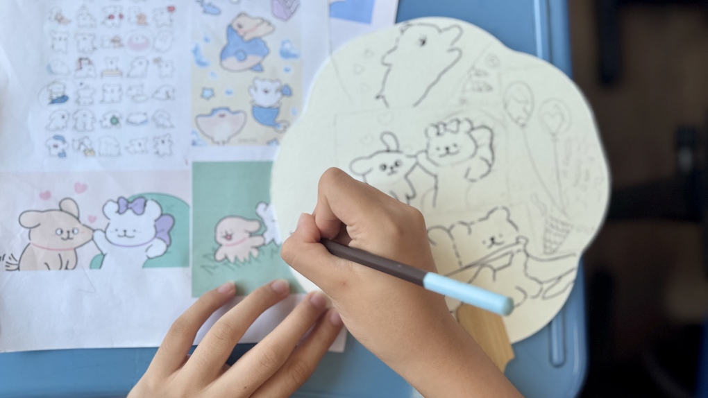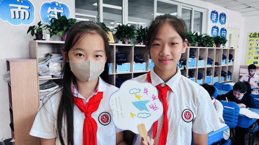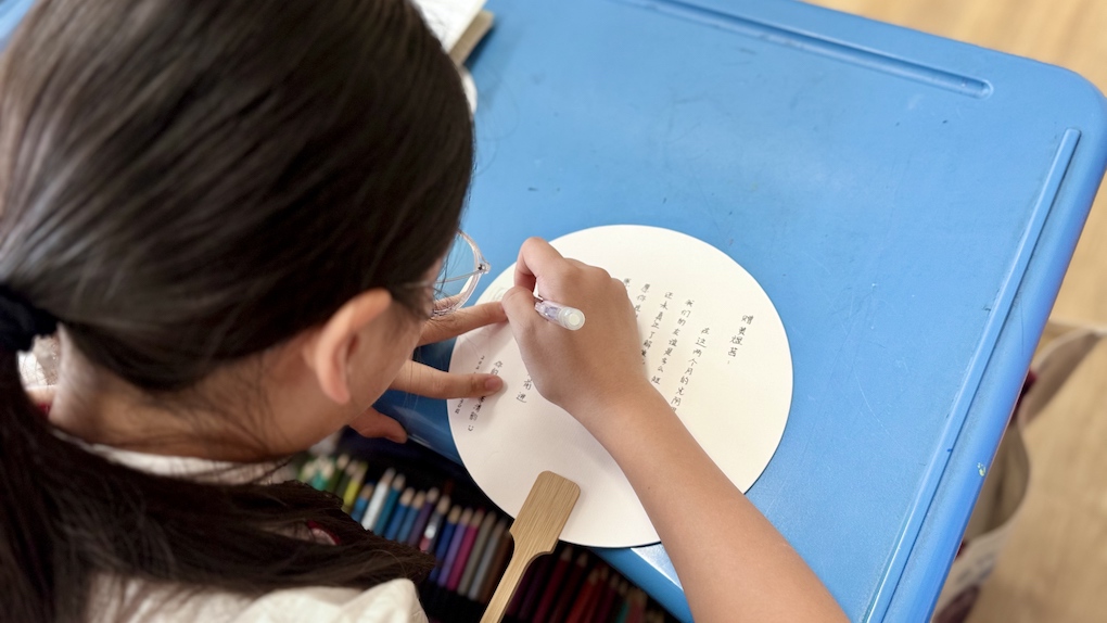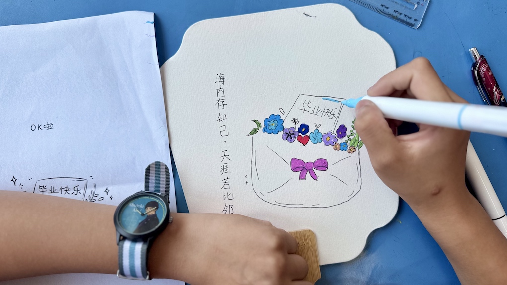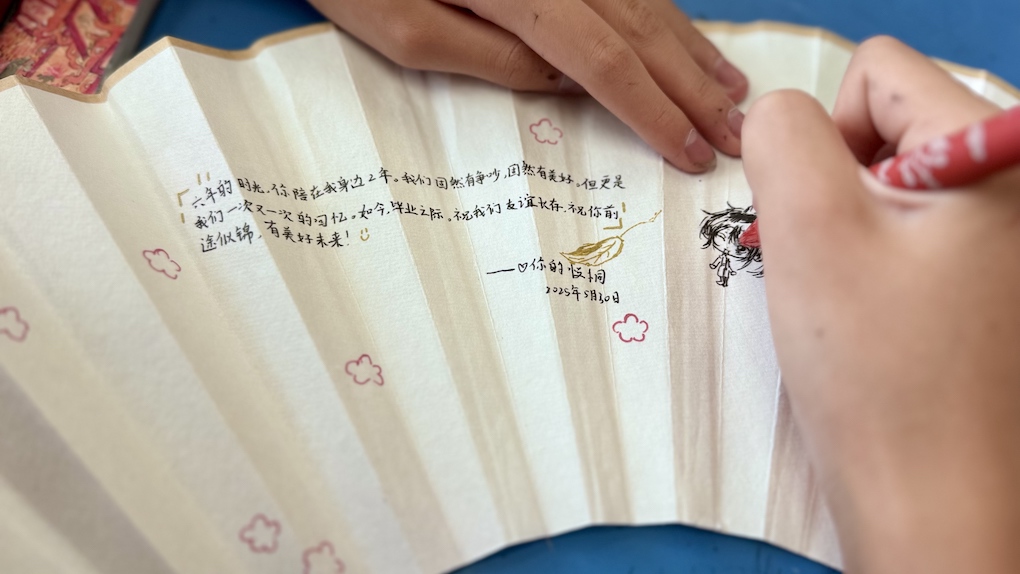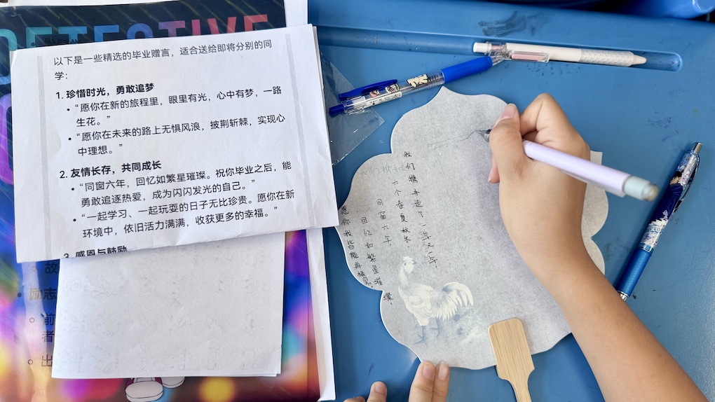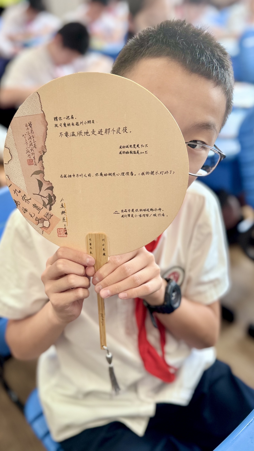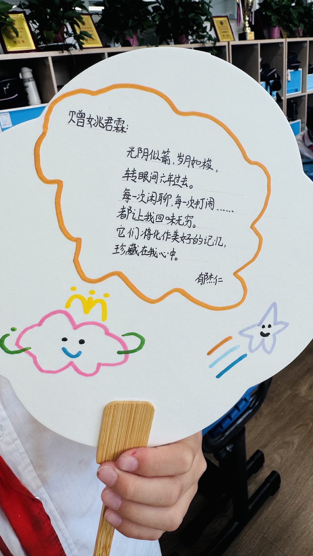 孩子们俯首案前,神情专注。笔尖游走处,有的细细勾勒校园里熟悉的梧桐与篮球架,将共同奔跑的记忆定格于方寸;有的则凝神写下“师恩难忘”、“未来可期”等朴拙却滚烫的祝福语。小桐同学精心描绘着竹子的风骨,她轻声说:“竹子一节一节向上生长,就像我们六年的时光,希望老师每次摇扇子,都能想起我们努力拔节的样子。”这些亲手完成的扇子,已非寻常物件,它们是时光的信物,是情谊的徽章,在离歌将起时无声诉说着珍重。