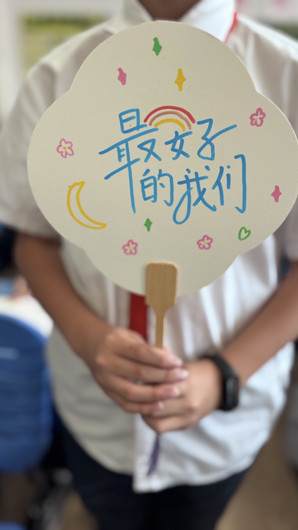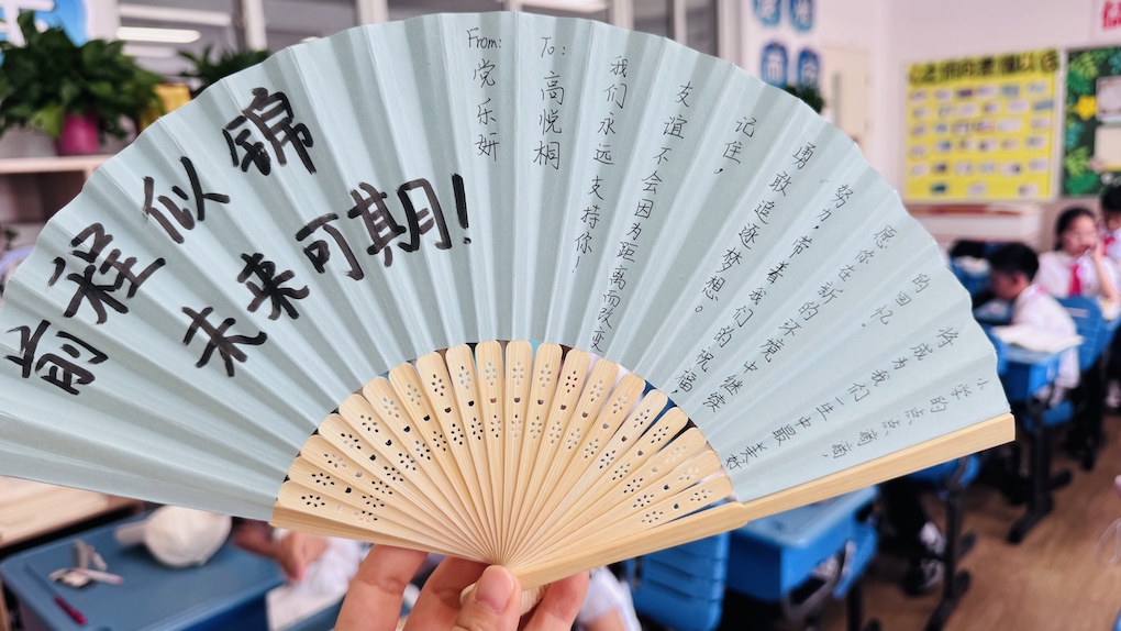 收到这份独特心意的老师们深受触动。班主任丁老师展开一面绘满全班卡通笑脸的扇子,笑意温柔:“这份心意比任何贵重礼物都珍贵。孩子们懂得用心意表达感恩,这本身便是成长最美的注脚。”数学段老师轻摇着绘有几何图案的扇子感慨:“小小扇面,盛满的是沉甸甸的师生情。”