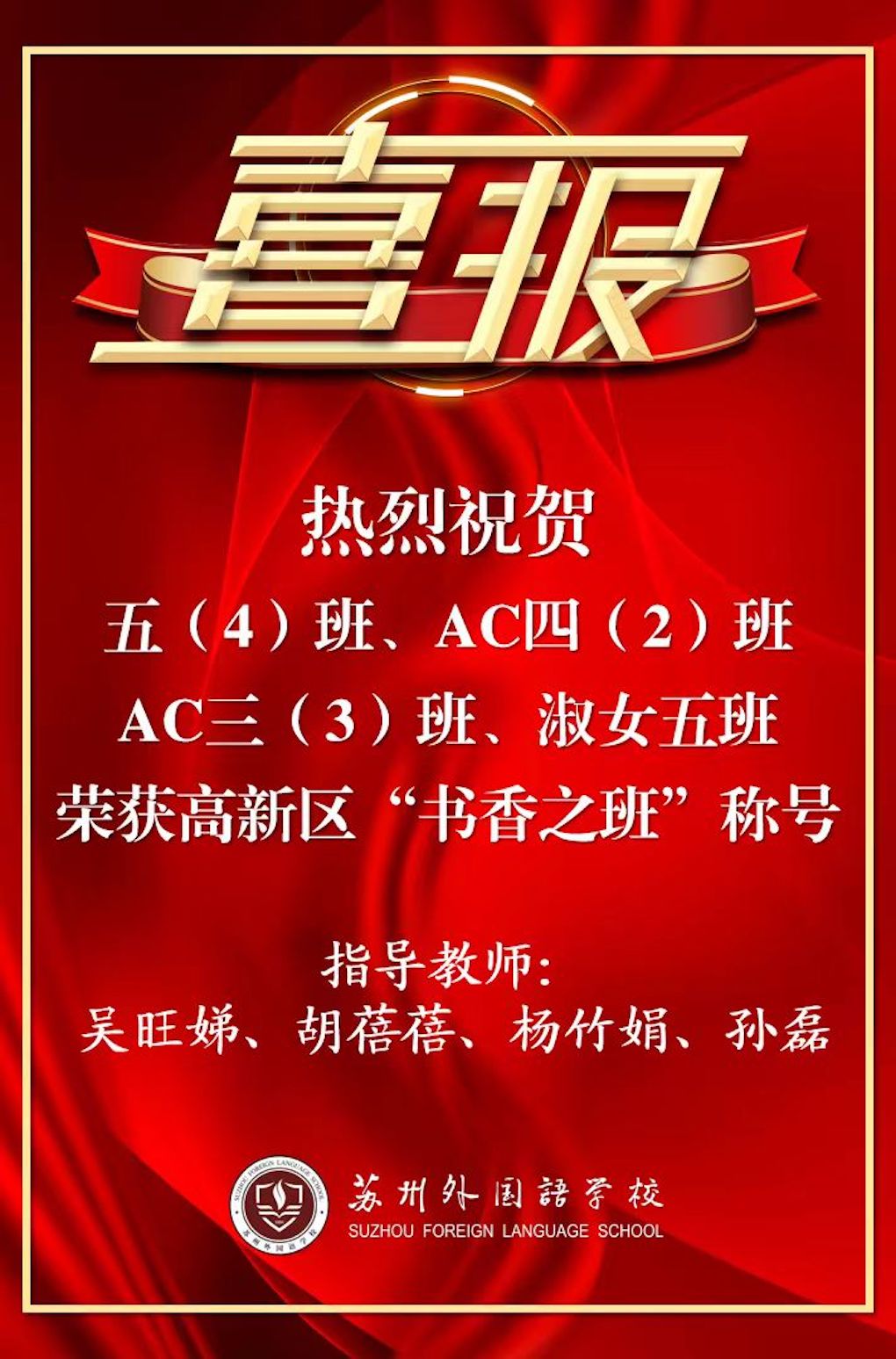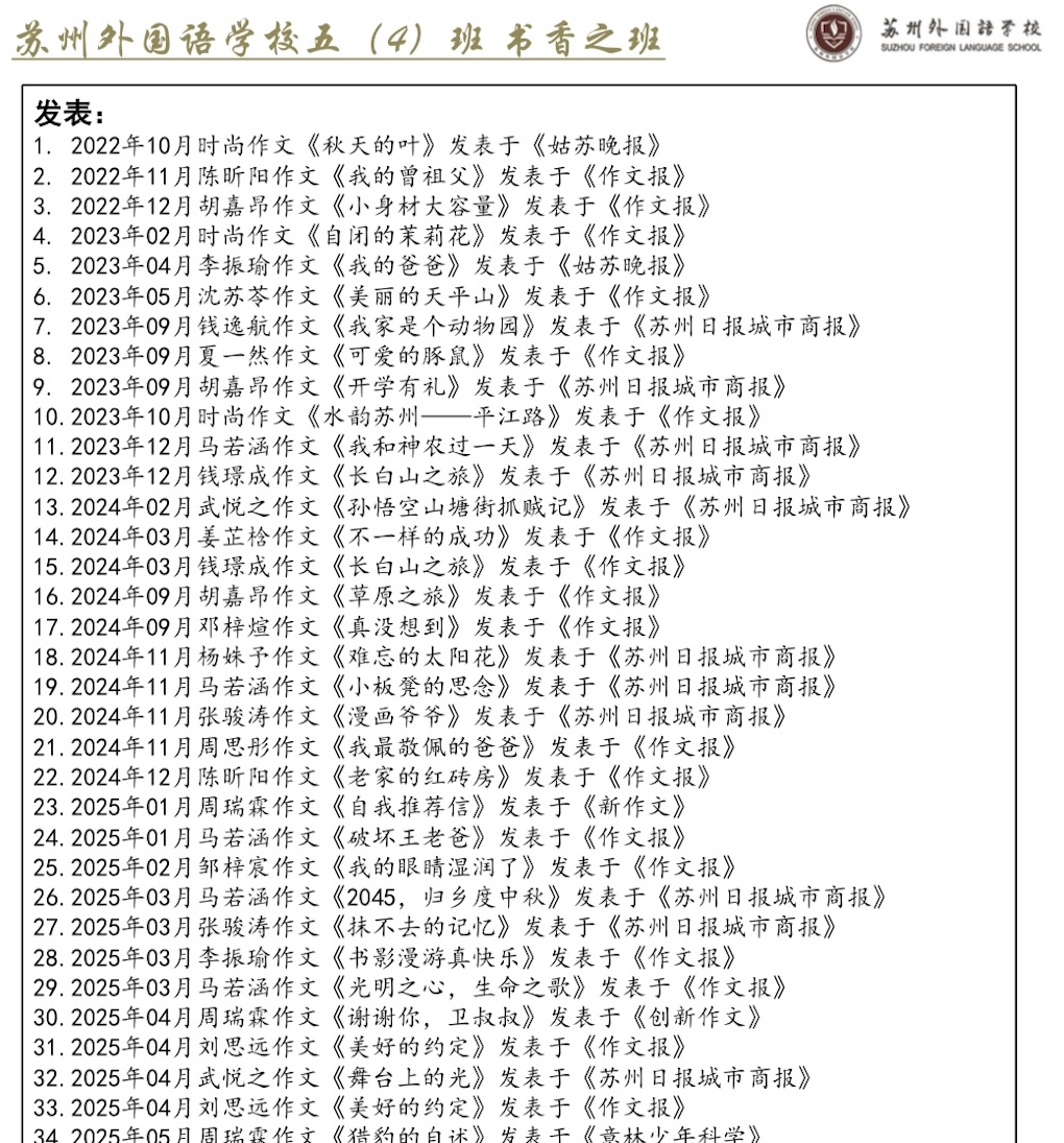 吴老师带领学生共读一本书《三国演义》、《西游记》、《水浒传》、《红楼梦》、《母亲》、《俗世奇人》等等,一起订阅了《语文学习报》《作文报》,不仅可以训练课内的知识点,更可以和孩子们一起阅读上面的文章,进行探讨学习,写下许多有趣的文章,有效提高了写作水平。将近三年的书香班级活动,同学们也颇有收获。一张张奖状,一次次发表,一次次阅读分享……都是孩子们阅读成果的证明。时尚、陈昕阳、马若涵、周瑞霖同学等多名的习作发表在《作文报》上,小眼睛大世界作文比赛有4名同学获得特等奖,语文报杯作文比赛,班级获奖比例非常高,全班有二十多人分别获特等奖、一等奖、二等奖,令人欣喜。接手4班以来,共累计开展读书交流会10次,撰写读书笔记和读后感200多篇,制作名著手抄报80多幅,人均阅读量达10本,发表各大报刊作文达34篇,最后班级被评为高新区“书香班级”。