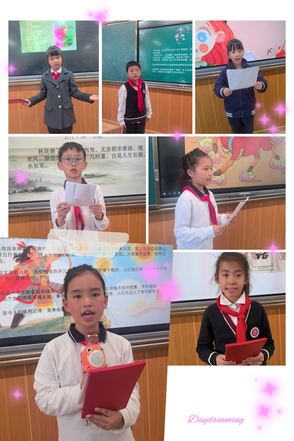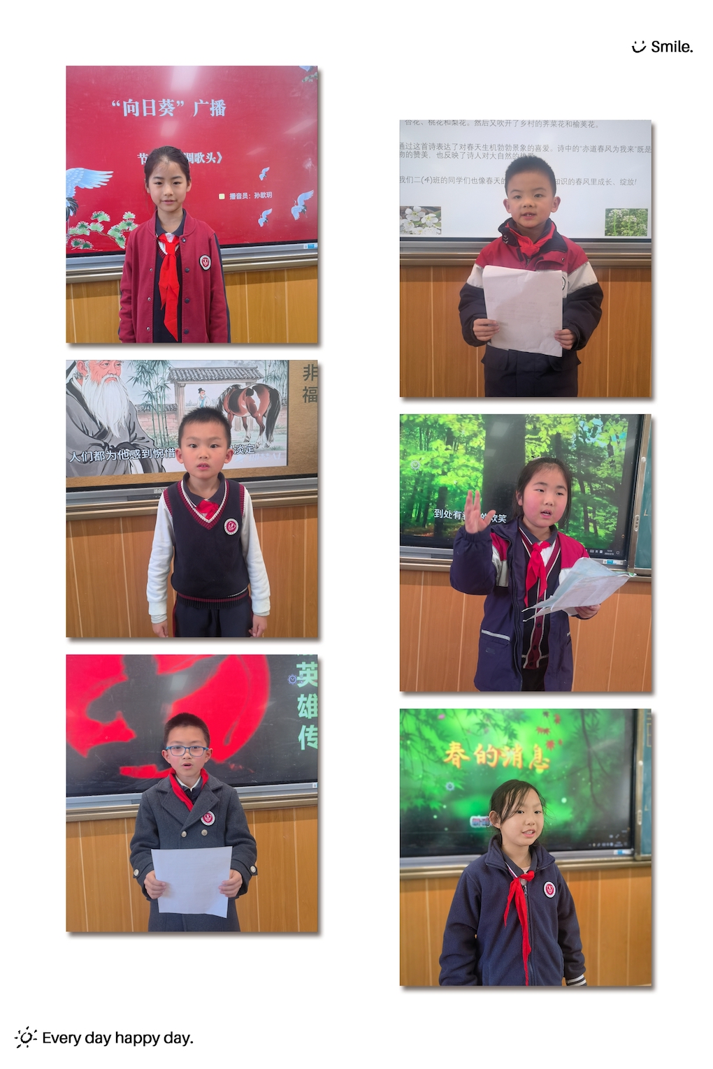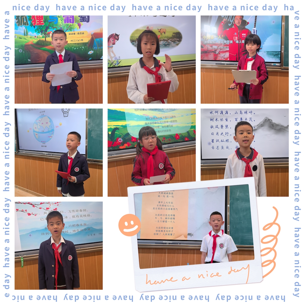 为了让孩子们能够更深入地分享阅读收获,班级举办了“向日葵”广播活动。每天一位孩子勇敢地走上讲台演讲,自信满满地讲述着自己的阅读故事。如果说第一轮,有的孩子还非常胆怯,演讲声音很轻,那么第二轮,孩子们就充满了自信。直到第三轮,孩子们纷纷抢着要上台分享。看着精美的背景,听着动听的朗诵,时不时还有“有奖问答”环节,演讲现场,掌声不断,同学们在聆听与表达中,进一步领略阅读的魅力,锻炼了语言表达和逻辑思维能力。这小小的舞台,给了孩子们尽情展示的机会,也得到家长们的支持和一致好评。
