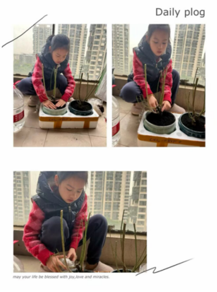 春分时分,阳光温暖地洒在大地上,昼夜均分,万物复苏。在学校我们继续深入学习农耕文化,了解春分时节适合种植的植物种类等相关知识。回家后,同学们行动起来,种下了更多心爱的植物。有的同学选择了花草,期待它们在不久后绽放出绚丽的花朵;有的同学则种下了蔬果,除草、施肥再到丰收,种植与收获的乐趣不一而足。通过这些活动,同学们不仅加深了对植物生长知识的理解,也从实践中体会到了生长的奇妙与美好。