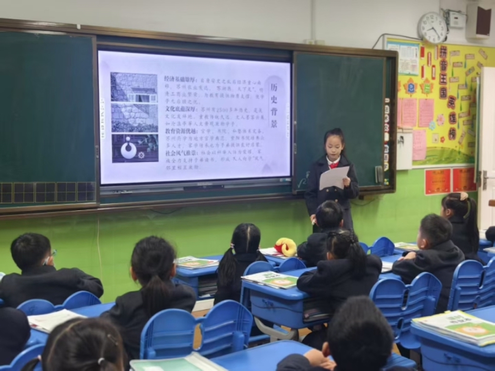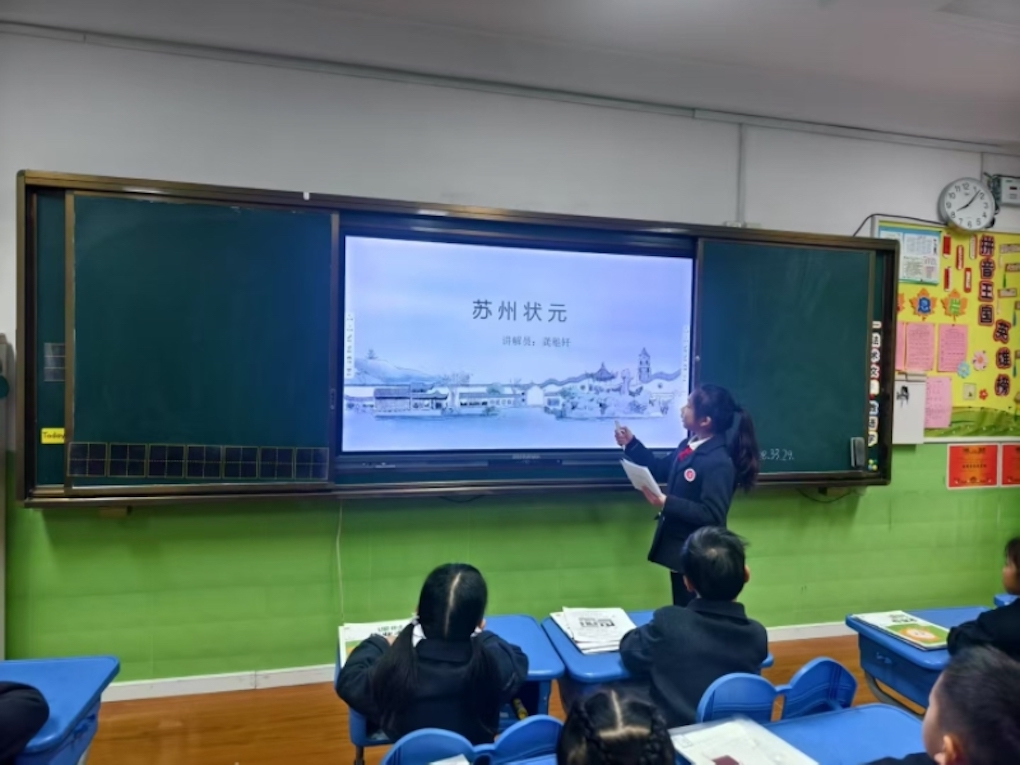 为深度挖掘苏州状元文化精髓,班级以多元活动为载体,精心搭建学习平台。每月一次的“状元文化小讲师”传承行动,让班级学生化身文化使者,走进一年级课堂。小讲师们精心准备,用生动语言讲述苏州状元的生平故事与文化贡献,让状元文化在校园中广泛传播。