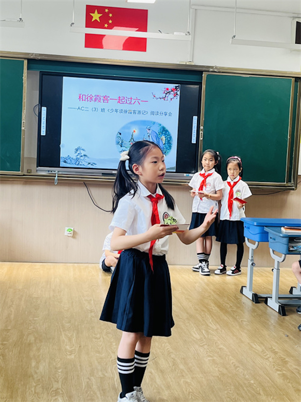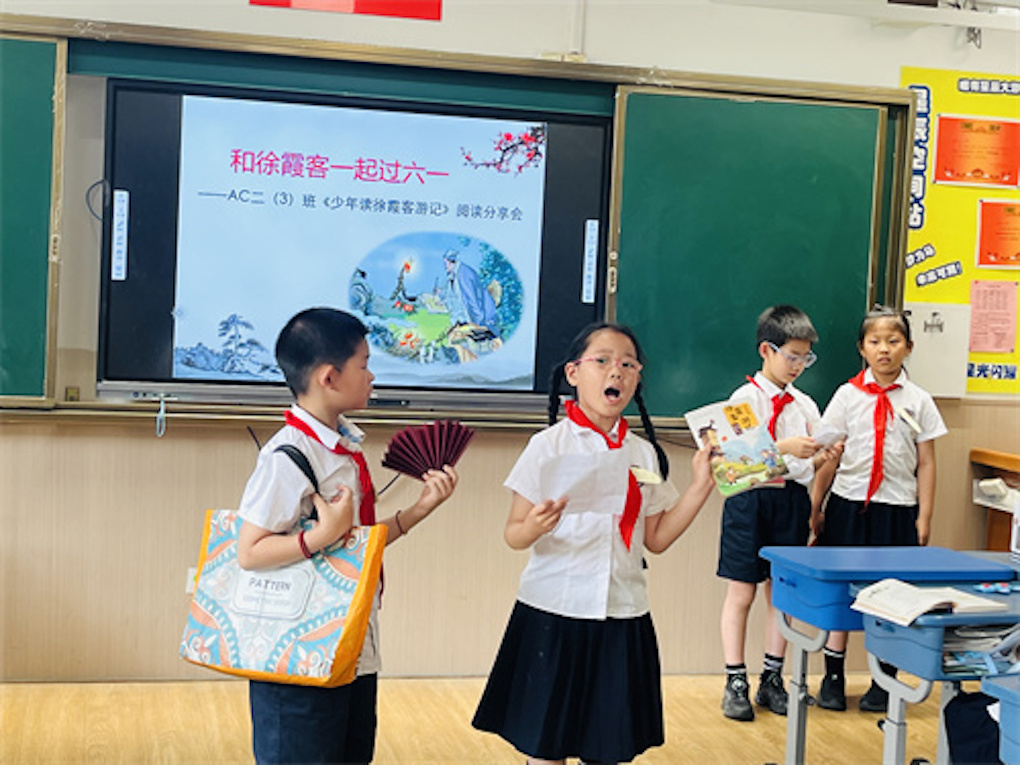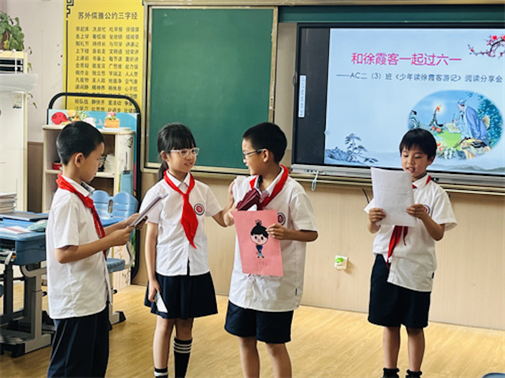 5月30日下午,班级组织了“和徐霞客一起过六一”读书分享会上,同学们化身"小徐霞客",分小组分享自己的读书心得和旅行故事。有的组用PPT展示旅途见闻,有的组分角色朗诵自己创作的游记,还有的用情景剧再现徐霞客的探险经历。戴上自制斗笠,拄着“登山杖”演绎一段登山的经典片段,“我现在知道‘喀斯特地貌’这个词了!”望着同学们骄傲的神情,深深感受到,一套游记,悄然播下了科学与勇气的种子。