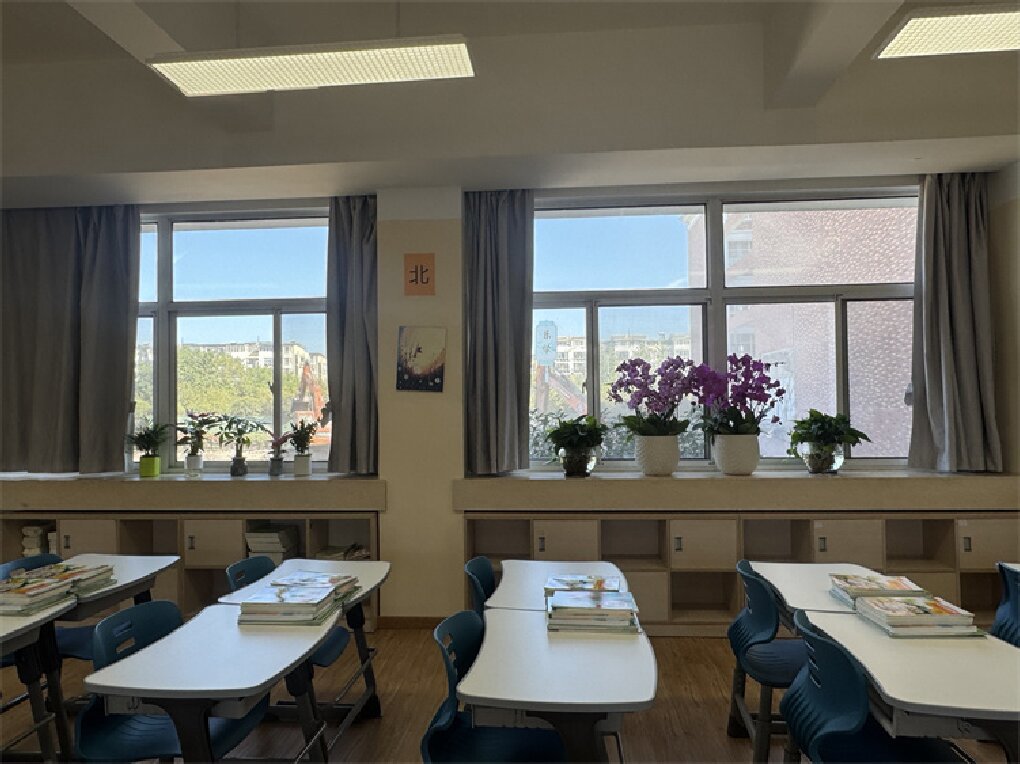 走进教室,明亮的窗户一尘不染,阳光透过玻璃洒满课堂。窗台与书架上,几盆蝴蝶兰开得雅致,粉紫花瓣舒展如蝶;绿萝藤蔓蜿蜒下垂,翠绿叶片生机勃勃。这些绿植由师生共同照料,既美化了班级环境,又让学生在观察植物生长中学会责任与守护,窗明几净的环境与鲜活绿植相映成趣,为新学期的学习生活注入满满活力。