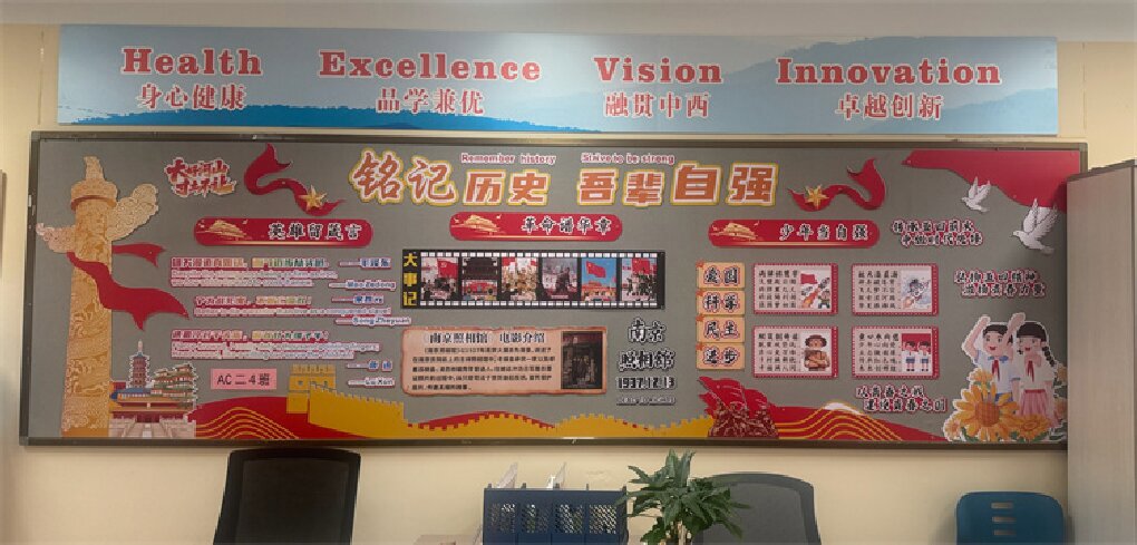 班级黑板报以“铭记历史、吾辈自强”为核心大标题,苍劲有力的字体瞬间点亮视觉焦点。版面巧妙划分三大板块,用“英雄留箴言”“革命谱华章”“少年当自强”三个小标题串联起红色记忆,搭配英文译文。中英文对照的设计既呼应苏外国际化特色,更让红色精神在中外语言碰撞中深入人心。