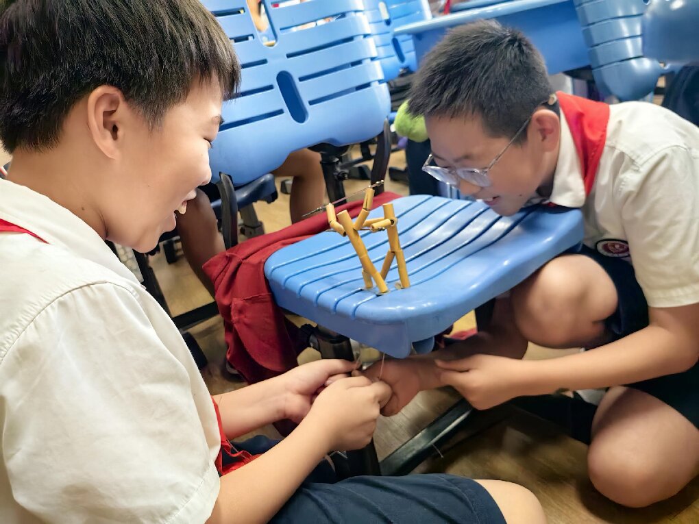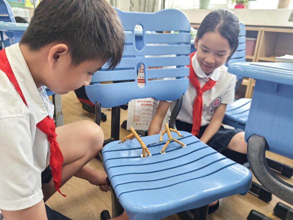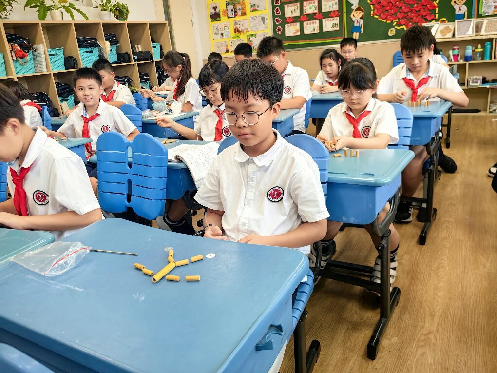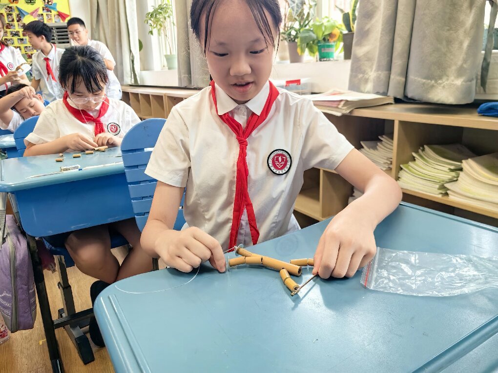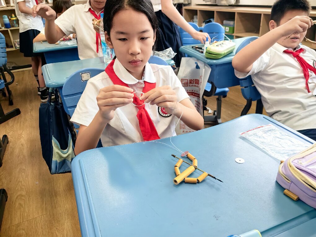 制作过程充满了探索与惊喜。如何让竹节人站稳?怎样设计武器才更威风?这些问题激发了孩子们无穷的创造力。小设计师们精心绘制草图,小工匠们细心打磨竹节,小艺术家们巧手装饰战袍。断线了重系,失衡了调整,每个细节都凝聚着耐心与智慧。当第一个竹节人在课桌上颤巍巍地站起来时,全组的欢呼声几乎掀翻屋顶。