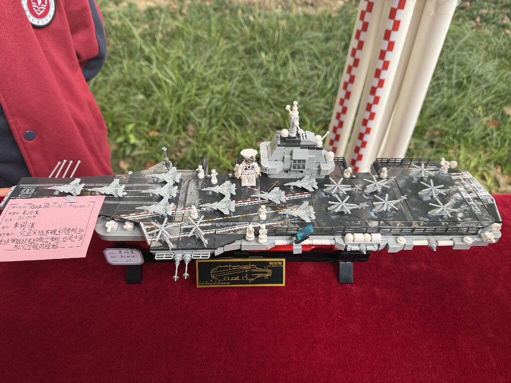 活动中,同学们热情高涨、创意十足。束词淇同学带来的福建舰模型堪称全场焦点,她凭借精准的比例把控和细致的细节处理,将这艘我国自主设计建造的航母完美还原。舰体的流线型轮廓、甲板上的舰载机布局,甚至舰岛的雷达设施都清晰可见,仿佛一艘蓄势待发的 “海上巨舰”,让同学们直观感受到我国海军的强大实力。