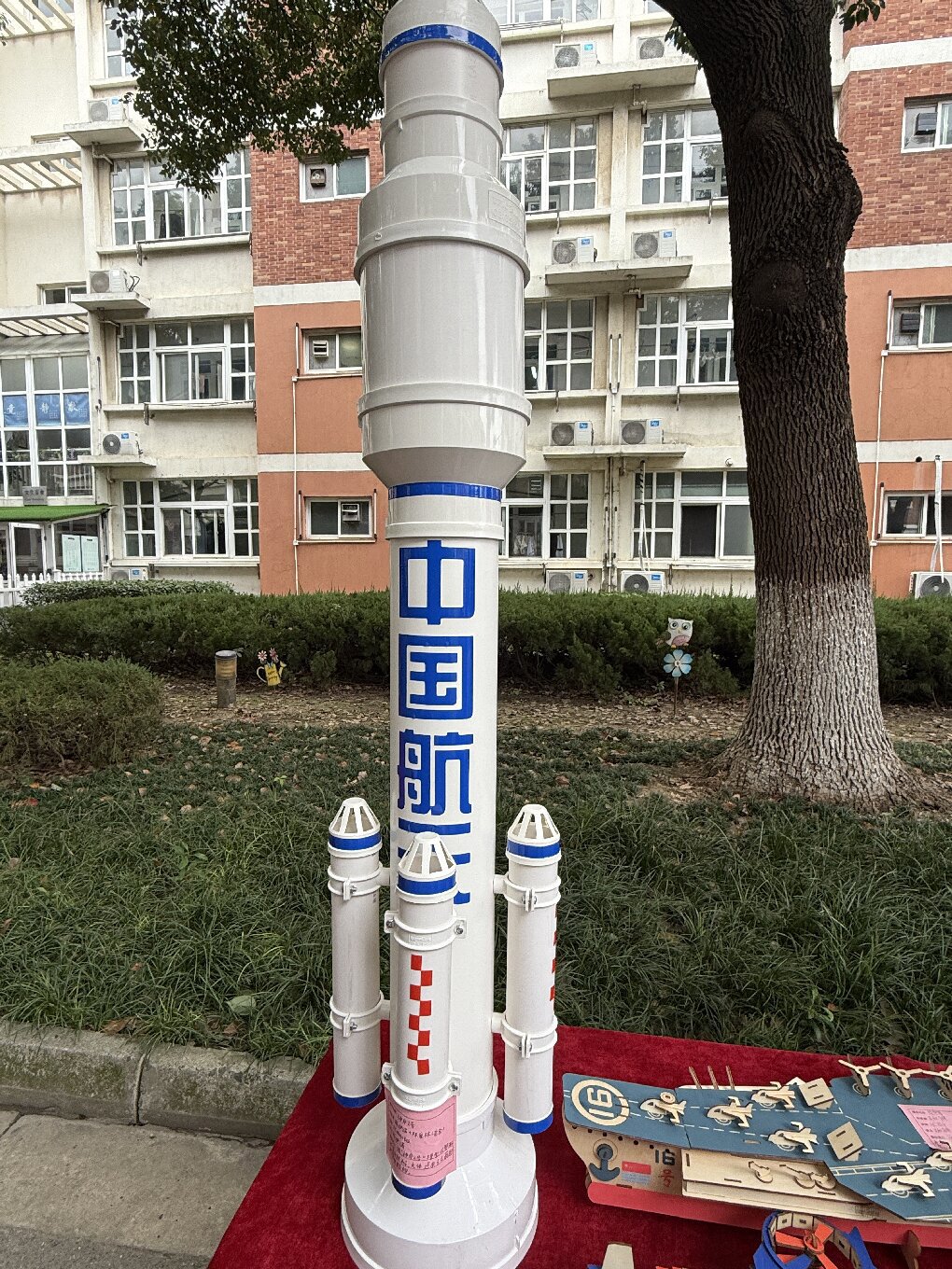 陈伊诺与徐以沫同学的作品同样令人眼前一亮,他们巧用常见的水管材料搭建火箭模型。彩色水管经过巧妙组合,形成了挺拔的火箭箭体,底部的助推器、顶部的整流罩一应俱全。最终完成的火箭模型不仅造型逼真,更传递出 “共筑航天梦” 的美好寓意,彰显了我国航天事业的蓬勃发展。