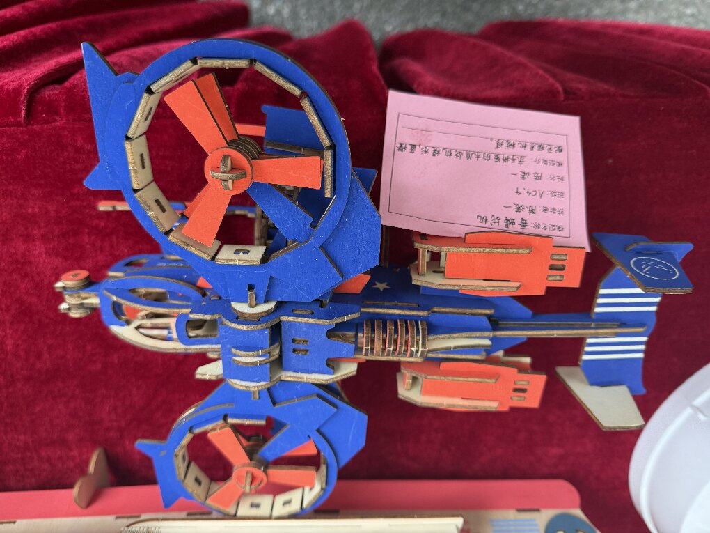 陈诺一同学的作品则展现了独特的匠心,他摒弃传统拼装材料,选用天然木材打造毒蝎战机模型。经过切割、打磨、拼接等多道工序,木质战机不仅保留了武器装备的凌厉线条,更增添了自然质感。机翼的弧度精准流畅,机身的纹路错落有致,充分体现了他的动手能力与创新思维,让大家看到了大国重器的另一种艺术表达。