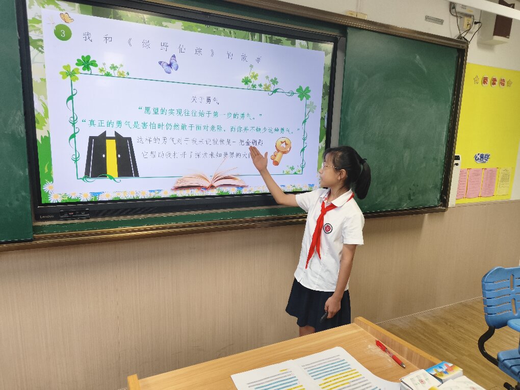周家羽同学首先带来了《绿野仙踪》的精彩讲述。她以清晰的逻辑和生动的语言,带领大家跟随多萝西的脚步,踏上那条通往翡翠城的黄色砖路。周家羽不仅复述了故事中惊险又温馨的情节,更分享了她从中学到的关于勇气、智慧与爱的真谛。她说:“每个人心中都有一条‘黄砖路’,只要勇敢前行,就能找到属于自己的奥兹国。”