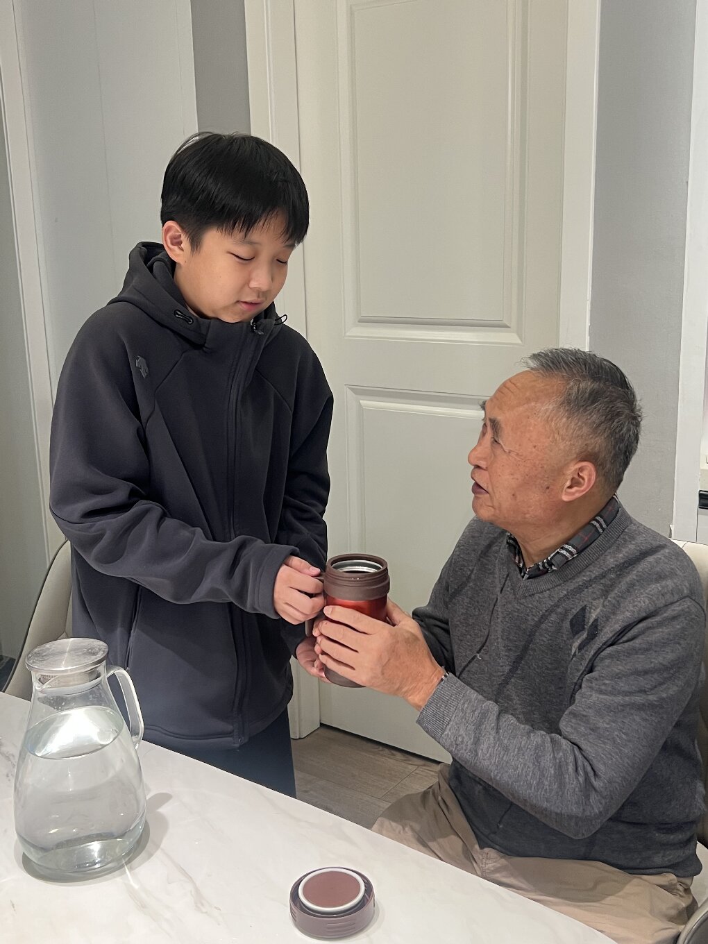 夜色初笼,小涵家的客厅茶香袅袅。她端坐茶桌前,温杯、置茶、冲泡、出汤,动作流畅而恭敬。她双手将一盏澄澈透亮的龙井捧至奶奶面前,轻声说:“奶奶,请用茶,祝您健康长寿。”奶奶接过这盏饱含深情的孝心茶,轻嗅其香,浅尝其味,那茶香仿佛顺着喉咙一直暖到了心底。她眼泛柔光,拉着小涵的手:“我的宝贝孙女泡的茶,是世上最甘醇的。”