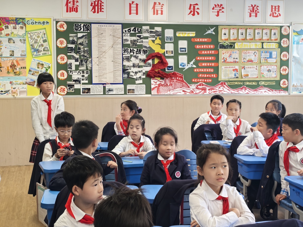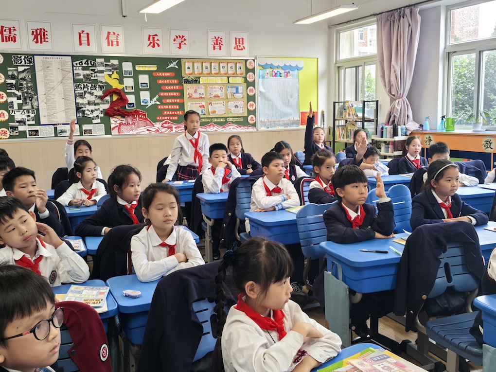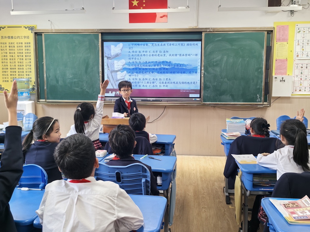 最令人振奋的当属问答环节。分享结束后,主持人结合三位同学的内容抛出问题,“牛顿发现万有引力的灵感来自什么?”“书中提到的古都里,哪座是唐朝的都城?”问题刚落,同学们立刻高高举起双手,有的甚至踮起脚尖、急切地喊着“我知道!”。被点到的同学准确作答时,台下会响起热烈掌声;偶尔有人卡顿,大家也会轻声提醒,互助友爱的氛围在教室中流淌——从这一双双高举的手中,足以看出同学们听得有多认真,也让每一份阅读收获都有了沉甸甸的分量。