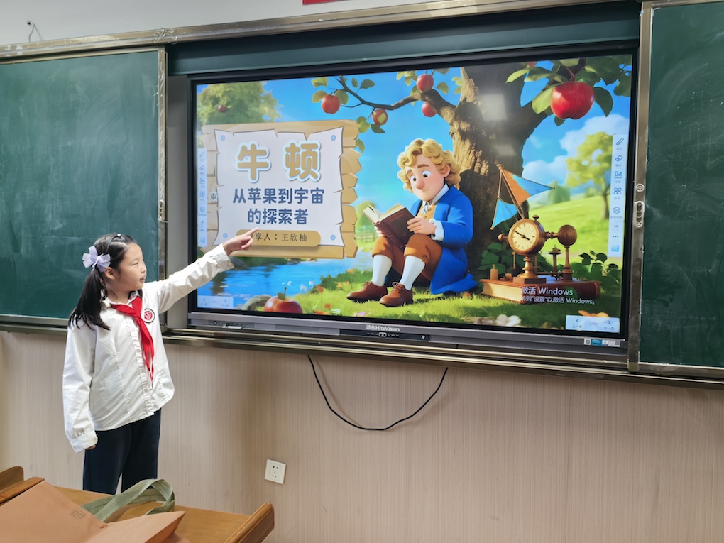 活动伊始,王欣柚同学带着对科学的好奇,率先分享物理学家牛顿的故事。她手持自制的故事卡片,从“苹果落地”的经典传说讲起,生动还原了牛顿观察、思考到提出万有引力定律的过程,稚嫩的声音里满是对科学的崇敬。分享尾声,她还主动拓展,向同学们介绍我国诺贝尔物理学奖得主杨振宁先生的科研经历,“原来我们国家也有这么厉害的科学家!”台下同学纷纷发出赞叹,科学探索的种子在悄然间萌芽。