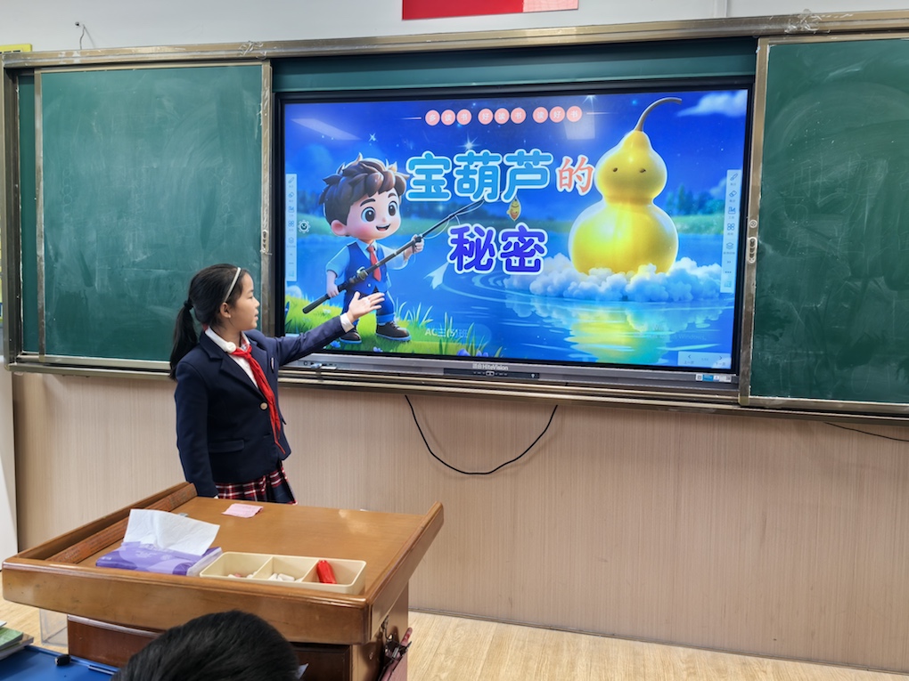 最后登场的李一诺同学,带来了与课本内容紧密贴合的《宝葫芦的秘密》。她紧扣故事主线,梳理主人公王葆从依赖宝葫芦到明白“劳动最光荣”的成长变化,还特意提出“如果你有宝葫芦,会用来做什么”的问题。熟悉的故事瞬间引发共鸣,同学们纷纷举手分享想法,在交流中深化了对人物形象的理解,也自然拓展了课内外阅读的深度。