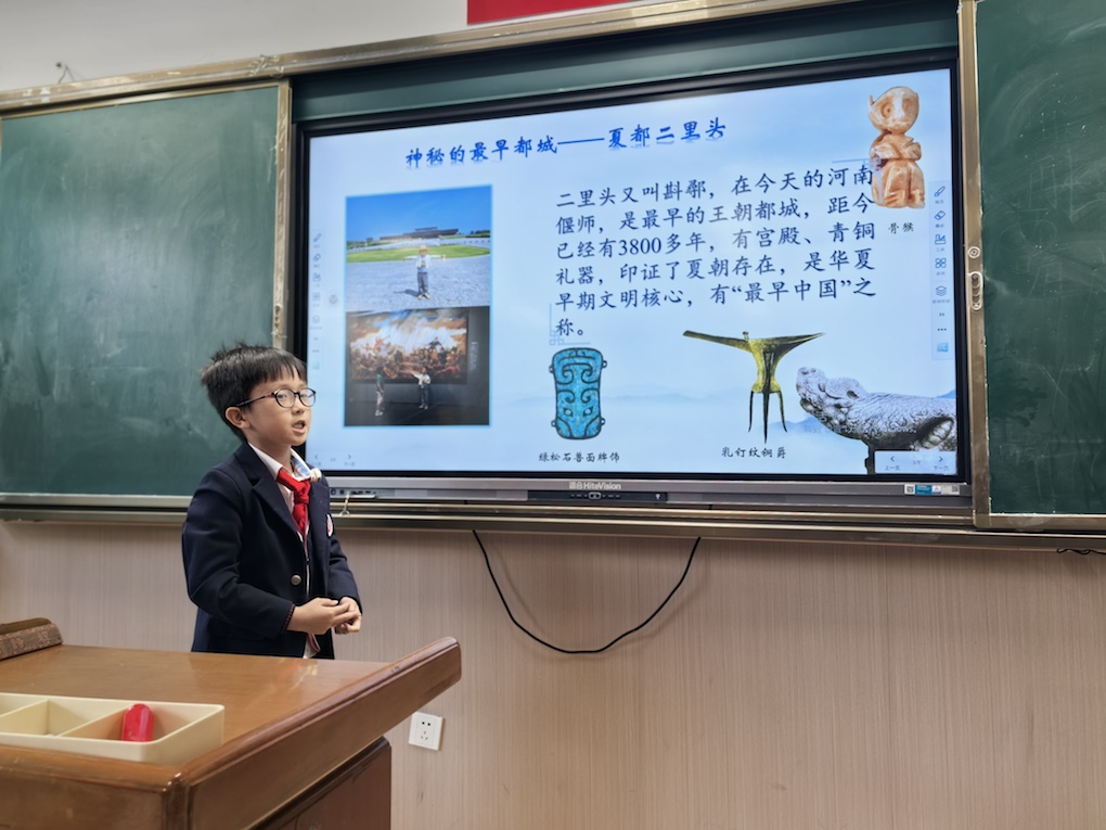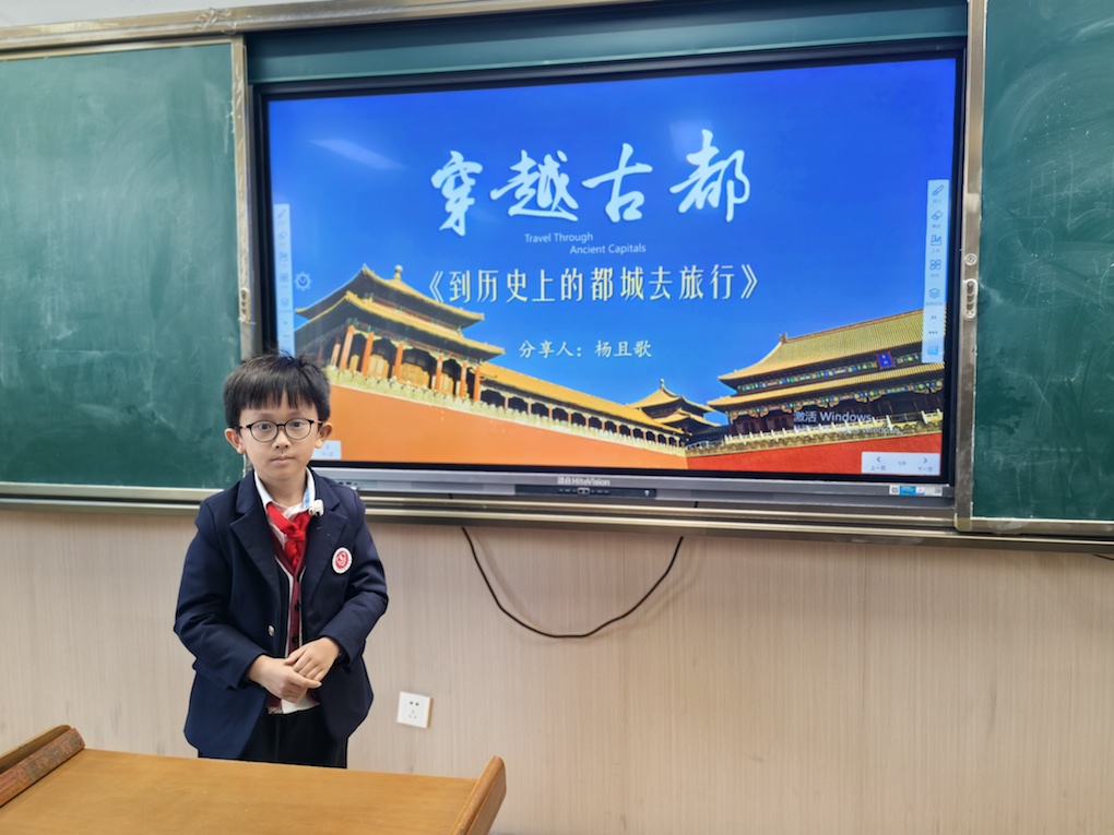 紧接着,杨且歌同学带着《到历史上的都城去旅行》走上讲台,化身“小小导游”。他结合书中插画和自己搜集的资料,从长安的朱雀大街讲到北京的故宫红墙,将不同朝代都城的建筑特色、民俗文化娓娓道来:“长安的集市里能买到西域的葡萄,北京的胡同里藏着老辈人的故事。”同学们听得入神,仿佛跟着他的讲述穿越时空,真切感受到一座城市承载的厚重历史,对“都城”的认知不再局限于课本,多了几分鲜活的温度。