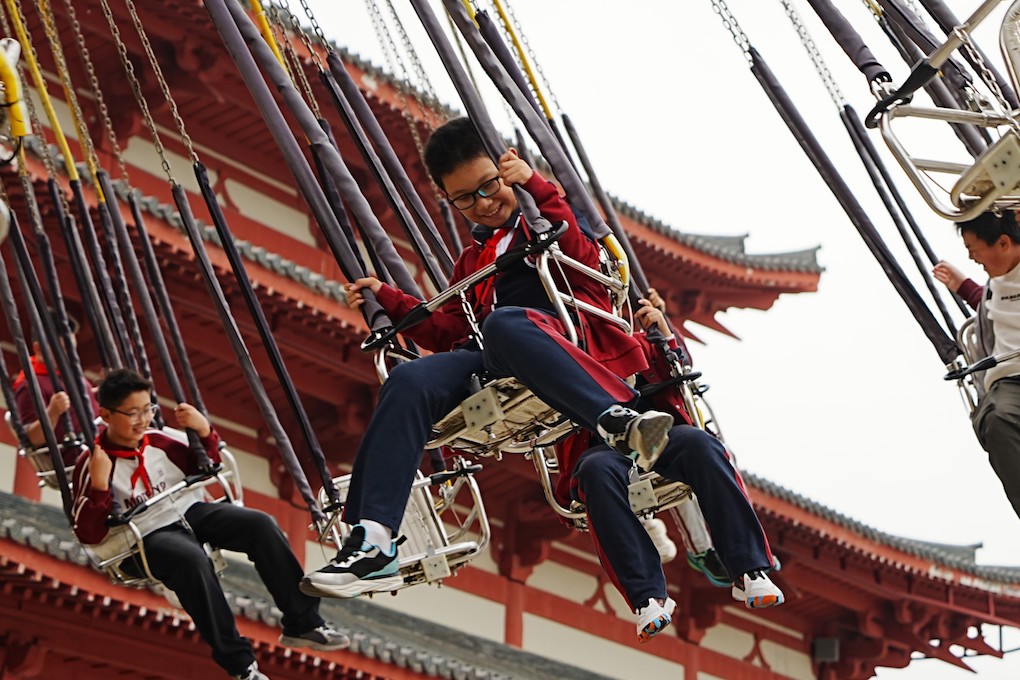 抵达乐园,色彩鲜艳的游乐设施在阴天里依旧格外吸睛,同学们欢呼着围拢过来。在老师的分组安排下,上午的游玩之旅正式开启。“海盗船” 前,胆大的同学率先入座,随着船体慢慢升高、快速摆动,耳边传来阵阵既紧张又过瘾的尖叫,阴天的风丝毫没减弱大家的热情,不少同学摆动中还不忘朝着同伴挥手,脸上满是征服挑战的自豪;旁边的 “集结号” 项目里,同学们手拉手坐进座舱,设备转动时,大家相互喊着加油,偶尔有人因紧张小声惊呼,身边的伙伴立刻拍拍肩膀安慰,友谊在欢笑中愈发深厚。