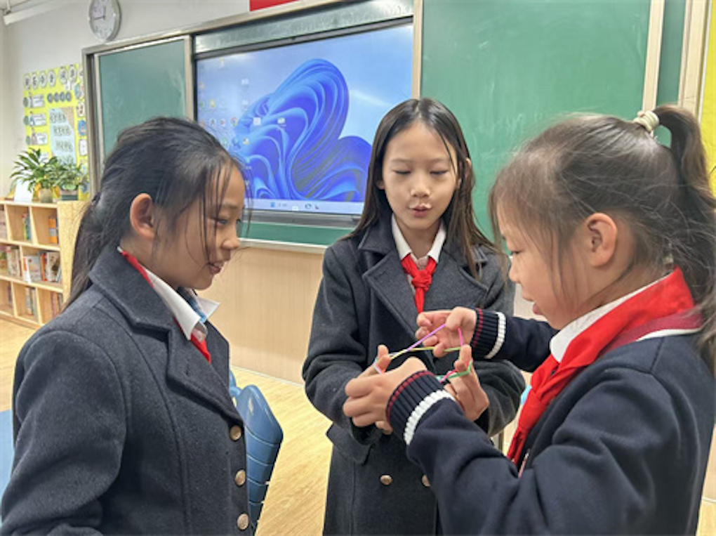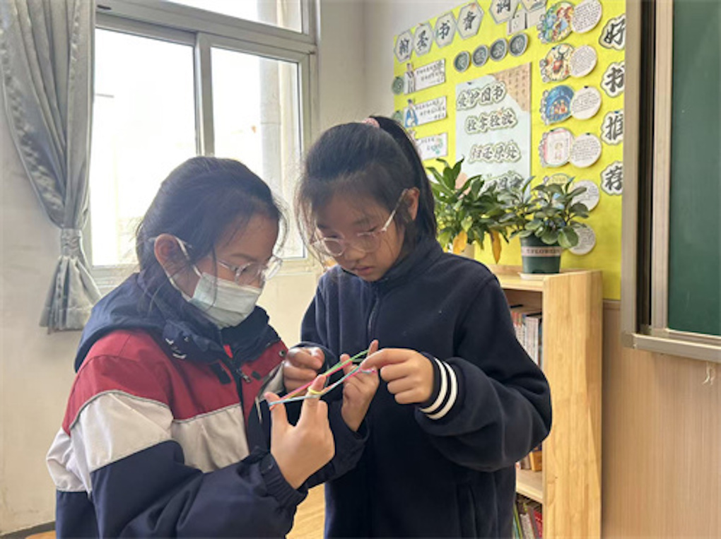 教室前面,讲台两侧,翻花绳“魔术秀”每天都准时上演。一根普通毛线,在中指、无名指间如灵动的精灵上下翻飞,瞬间变成“降落伞”,变成“飞机”,变成“蝴蝶”。男生小刘同学原本还嫌弃这是“女生才玩的”,结果他第一个编出了“五角星”,被同学们封为“绳王”。