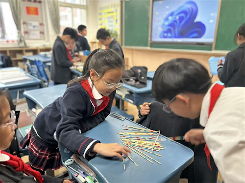 最受欢迎的游戏当属“挑竹签”啦。小费同学把40根彩棒如攥着一把宝藏般攥在手心,“啪”地撒开,随后便屏息凝神地挑动起来。围观的同学自动组成了“后援团”,只要谁不小心碰到了棒,大家就会齐声叹气。才过了三天呢,大家就已经能精准地算出“金棒5分、红棒10分”,就连任课老师也被拉来一起“PK”。