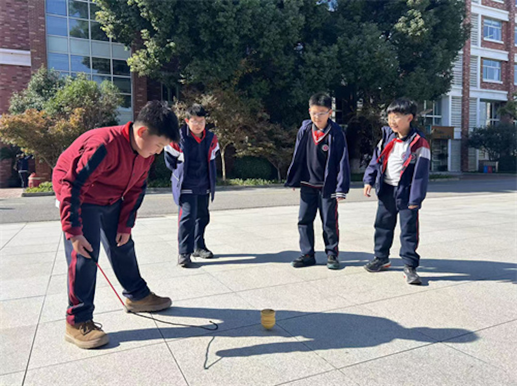 午饭后,AC四7班教室仿佛瞬间穿越到了“80年代游乐场”。瞧,有人把彩色竹签撒落开来,那竹签瞬间好似绽放成了一朵绚丽的“花”;有人脚勾着皮筋,嘴里还念念有词,喊着口诀“马兰开花二十一”;而教室外,不时传来“啪!啪!”清脆的甩陀螺声。本学期,班级开展了“收集父母辈儿时游戏,带回校园分享”的活动,孩子们可积极啦,把爸妈童年的“存货”都翻了个底朝天。