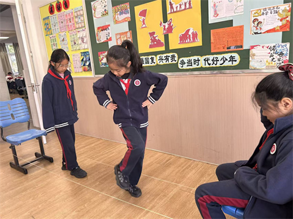 教室后面,皮筋小队把皮筋温柔地缠成“人”字形,接着右脚、左脚、绕圈,要是动作失败了,就从头再来。最灵巧的小郑同学一口气完成了“三角跳”,赢得了一片热烈的掌声,大家还笑着说:“比我妈妈还多跳了两步呢!”